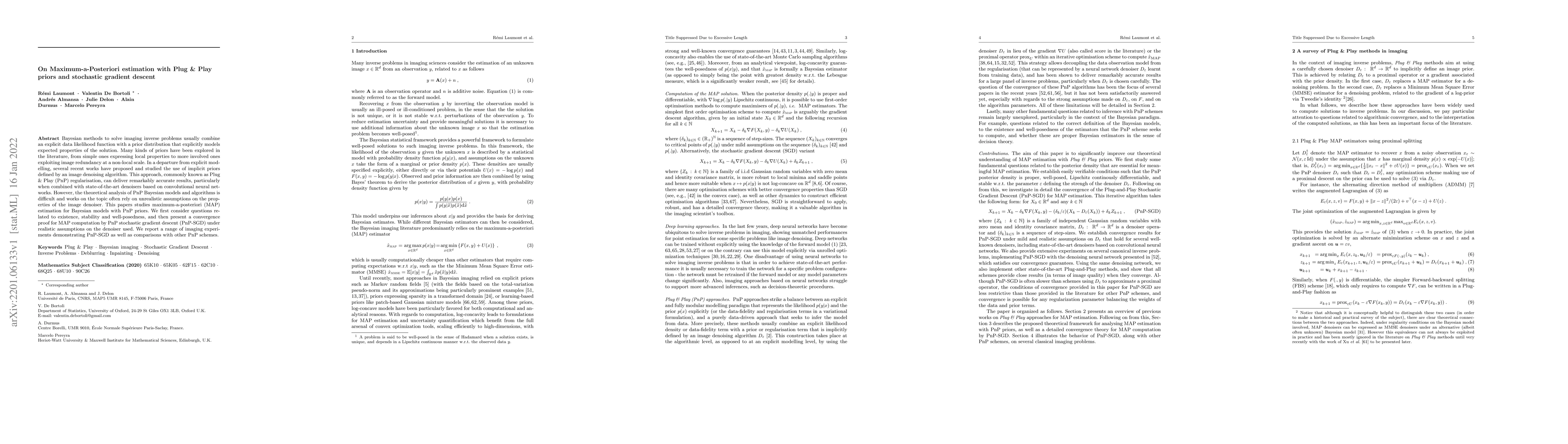 Bayesian methods to solve imaging inverse problems usually combine an explicit data likelihood function with a prior distribution that explicitly models expected properties of the solution. Many kinds of priors have been explored in the literature, from simple ones expressing local properties to more involved ones exploiting image redundancy at a non-local scale. In a departure from explicit modelling, several recent works have proposed and studied the use of implicit priors defined by an image denoising algorithm. This approach, commonly known as Plug & Play (PnP) regularisation, can deliver remarkably accurate results, particularly when combined with state-of-the-art denoisers based on convolutional neural networks. However, the theoretical analysis of PnP Bayesian models and algorithms is difficult and works on the topic often rely on unrealistic assumptions on the properties of the image denoiser. This papers studies maximum-a-posteriori (MAP) estimation for Bayesian models with PnP priors. We first consider questions related to existence, stability and well-posedness, and then present a convergence proof for MAP computation by PnP stochastic gradient descent (PnP-SGD) under realistic assumptions on the denoiser used. We report a range of imaging experiments demonstrating PnP-SGD as well as comparisons with other PnP schemes.