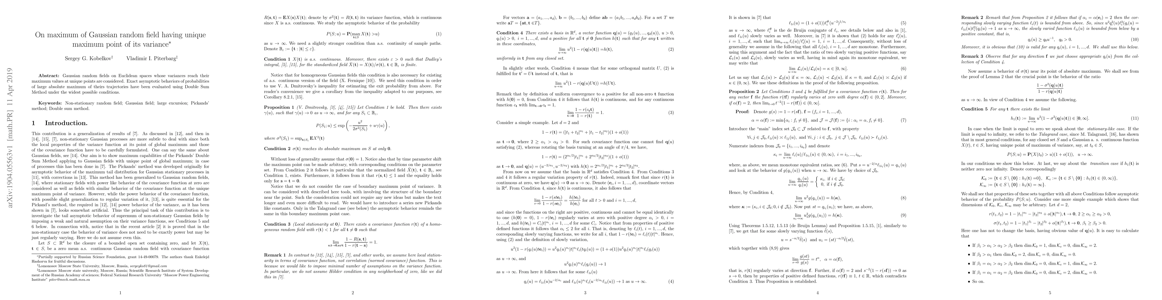 Researchers studied Gaussian random fields with unique maximum points of their variances, analyzing asymptotic behaviors and probabilities of large absolute maxima using the Double Sum Method. The study aimed to understand extreme values in these fields under various conditions.