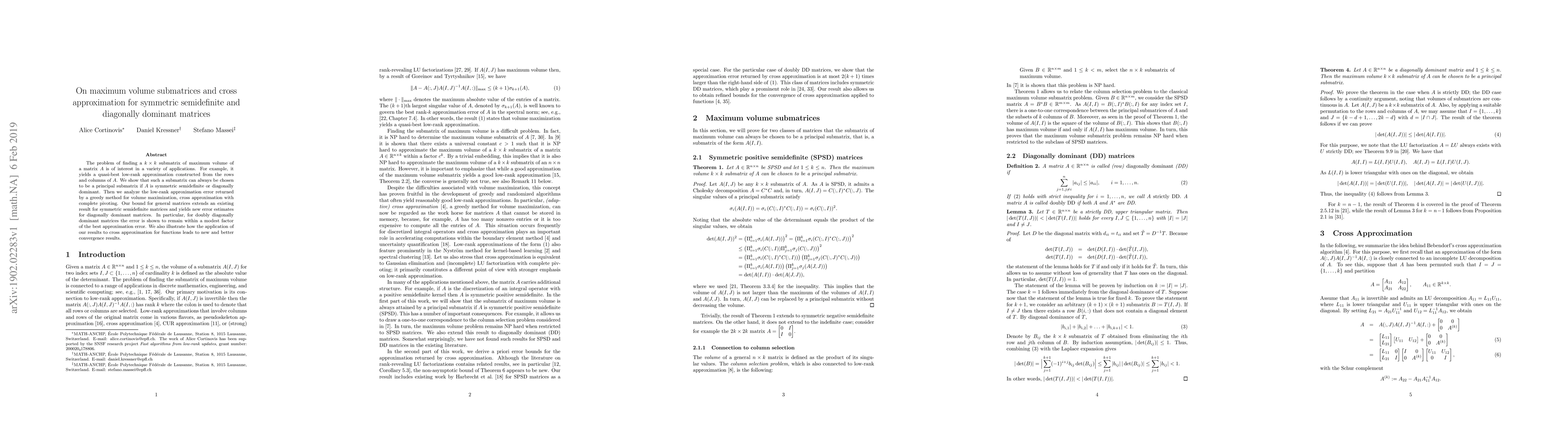 The problem of finding a $k \times k$ submatrix of maximum volume of a matrix $A$ is of interest in a variety of applications. For example, it yields a quasi-best low-rank approximation constructed from the rows and columns of $A$. We show that such a submatrix can always be chosen to be a principal submatrix if $A$ is symmetric semidefinite or diagonally dominant. Then we analyze the low-rank approximation error returned by a greedy method for volume maximization, cross approximation with complete pivoting. Our bound for general matrices extends an existing result for symmetric semidefinite matrices and yields new error estimates for diagonally dominant matrices. In particular, for doubly diagonally dominant matrices the error is shown to remain within a modest factor of the best approximation error. We also illustrate how the application of our results to cross approximation for functions leads to new and better convergence results.