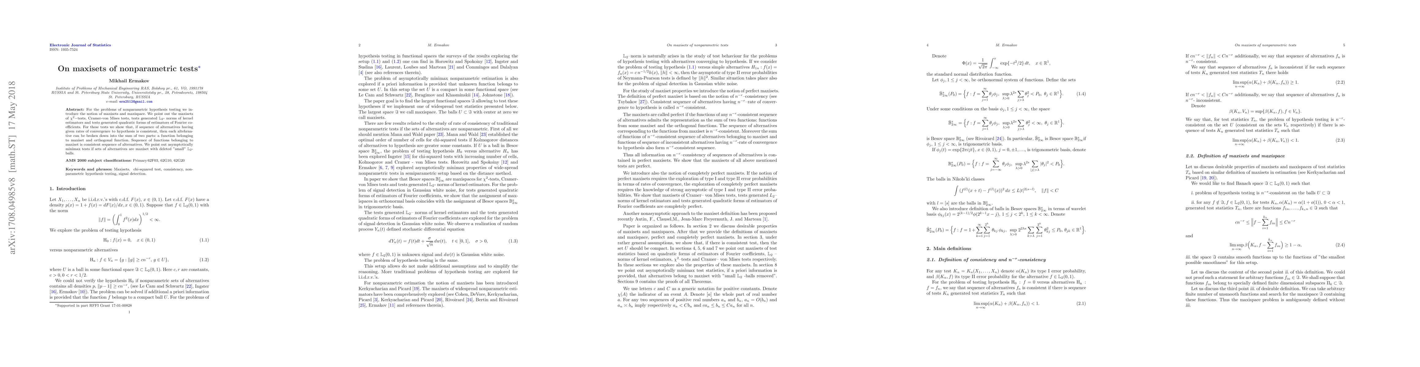 This paper introduces the concepts of maxisets and maxispaces in the context of nonparametric hypothesis testing. It demonstrates that under certain conditions, alternatives to the null hypothesis can be decomposed into components that belong to the maxiset and orthogonal functions. The paper also discusses asymptotically minimax tests when the alternative sets resemble maxisets with small $\mathbb{L}_2$-balls removed.