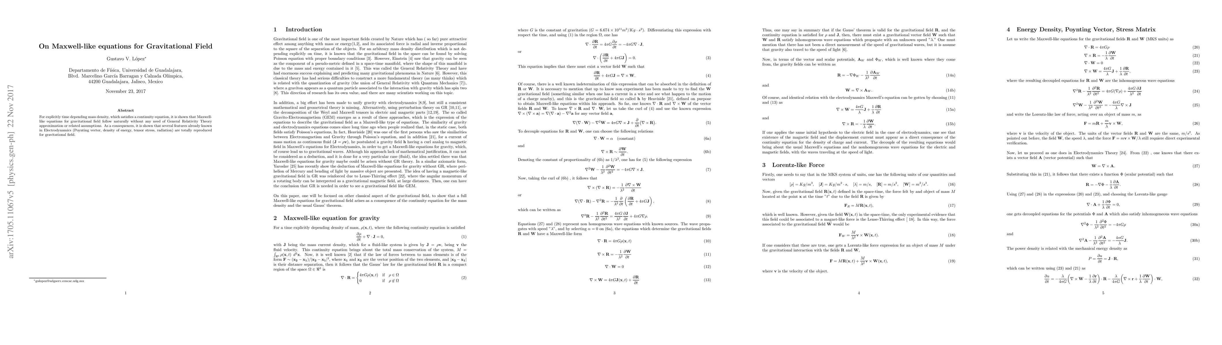 For explicitly time depending mass density, which satisfies a continuity equation, it is shown that Maxwell-like equations for gravitational field follow naturally without any need of General Relativity Theory approximation or related assumptions. As a consequences, it is shown that several features already known in Electrodynamics (Poynting vector, density of energy, tensor stress, radiation) are totally reproduced for gravitational field.