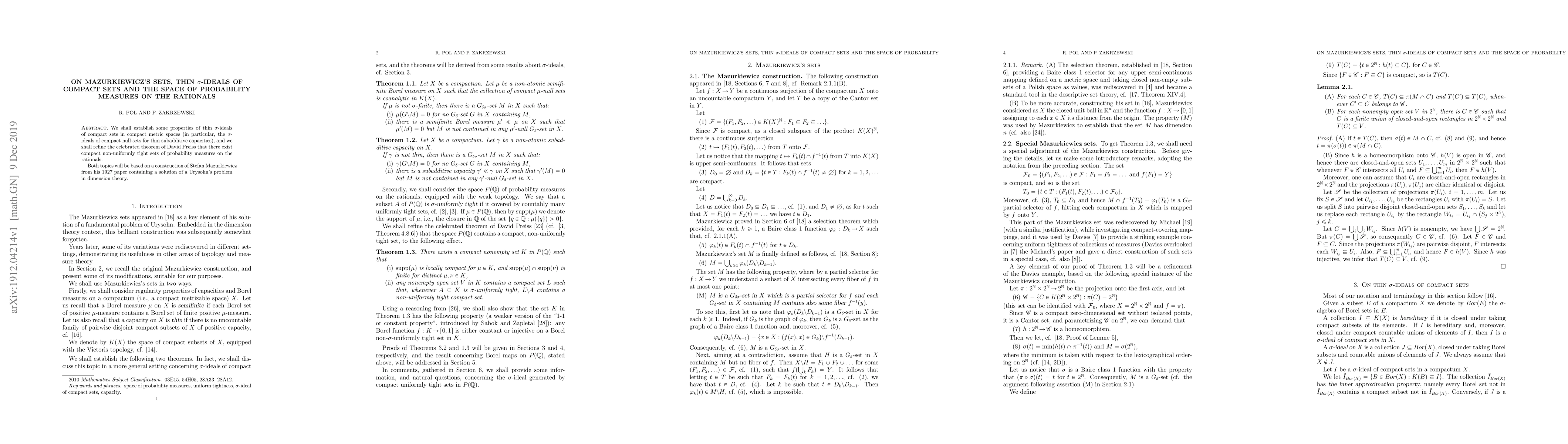 We shall establish some properties of thin $\sigma$-ideals of compact sets in compact metric spaces (in particular, the $\sigma$-ideals of compact null-sets for thin subadditive capacities), and we shall refine the celebrated theorem of David Preiss that there exist compact non-uniformly tight sets of probability measures on the rationals. Both topics will be based on a construction of Stefan Mazurkiewicz from his 1927 paper containing a solution of a Urysohn's problem in dimension theory.