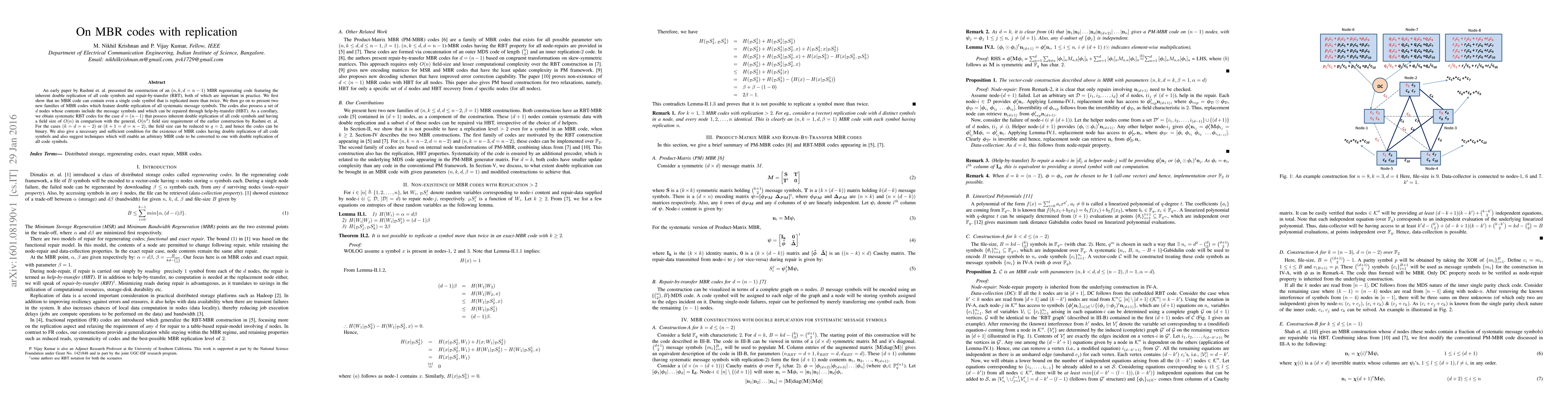 Researchers developed new families of MBR codes with double replication of systematic message symbols and found that no code can have a single symbol replicated more than twice. This improves upon earlier constructions and provides smaller field sizes for certain cases.