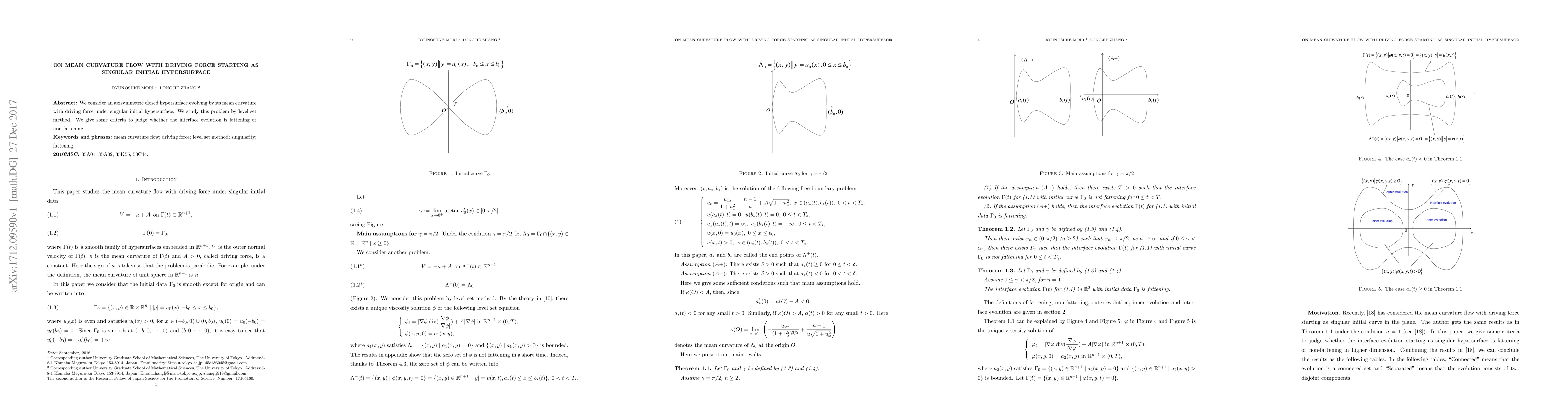 Summary: This paper investigates the evolution of axisymmetric closed hypersurfaces under mean curvature flow with a driving force, beginning from singular initial conditions, using the level set method, and provides criteria to determine if the interface evolves to become thicker or remains thin.