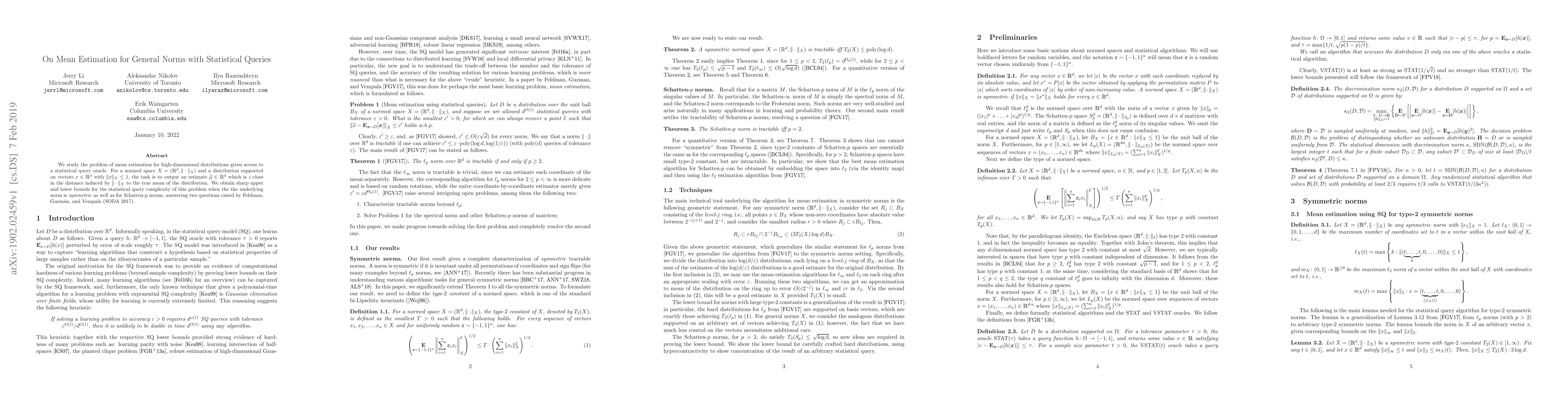 We study the problem of mean estimation for high-dimensional distributions, assuming access to a statistical query oracle for the distribution. For a normed space $X = (\mathbb{R}^d, \|\cdot\|_X)$ and a distribution supported on vectors $x \in \mathbb{R}^d$ with $\|x\|_{X} \leq 1$, the task is to output an estimate $\hat{\mu} \in \mathbb{R}^d$ which is $\epsilon$-close in the distance induced by $\|\cdot\|_X$ to the true mean of the distribution. We obtain sharp upper and lower bounds for the statistical query complexity of this problem when the the underlying norm is symmetric as well as for Schatten-$p$ norms, answering two questions raised by Feldman, Guzm\'{a}n, and Vempala (SODA 2017).