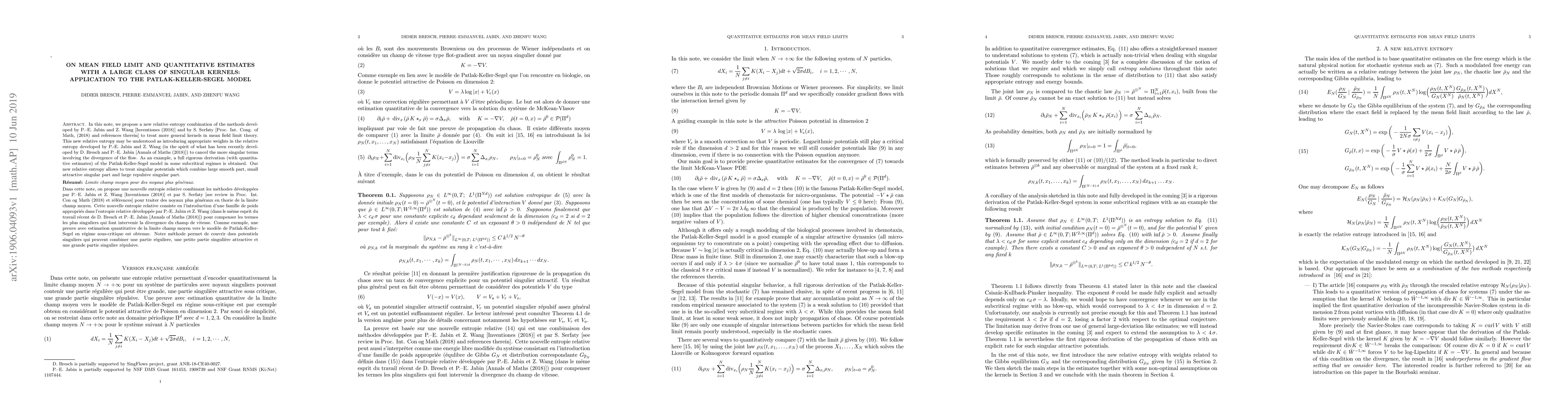 In this note, we propose a new relative entropy combination of the methods developed by P.--E. Jabin and Z.~Wang [Inventiones (2018)] and by S. Serfaty [Proc. Int. Cong. of Math, (2018) and references therein] to treat more general kernels in mean field limit theory. This new relative entropy may be understood as introducing appropriate weights in the relative entropy developed by P.-E. Jabin and Z. Wang (in the spirit of what has been recently developed by D.~Bresch and P.--E. Jabin [Annals of Maths (2018)]) to cancel the more singular terms involving the divergence of the flow. As an example, a full rigorous derivation (with quantitative estimates) of the Patlak-Keller-Segel model in some subcritical regimes is obtained. Our new relative entropy allows to treat singular potentials which combine large smooth part, small attractive singular part and large repulsive singular part.