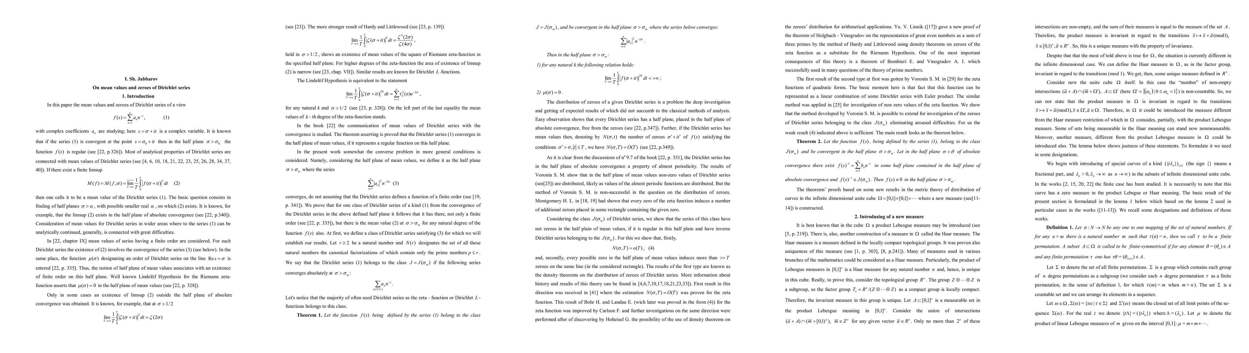 In this paper we study the mean values and zeroes of Dirichlet series of a view $\sum_{n}a_n n^{-s}$ with complex coefficients. There was introduced some class of Dirichlet series including such widely used series as the Riemann zeta-function, Dirichlet L-functions and ets. A new point of view is introduced in defining of a half plane of mean values. It was proven that in the half plane of mean values any natural degree of the series of an inroduced class, being regular in this half plane,has a mean value. In particular, the analog of Lindel\"of Hypothesis is true. If, in addition, the Dirichlet series f(s) belongs to this class with the function f(s)^{-1} then the half plane of mean values was proved to be free from the zeroes.