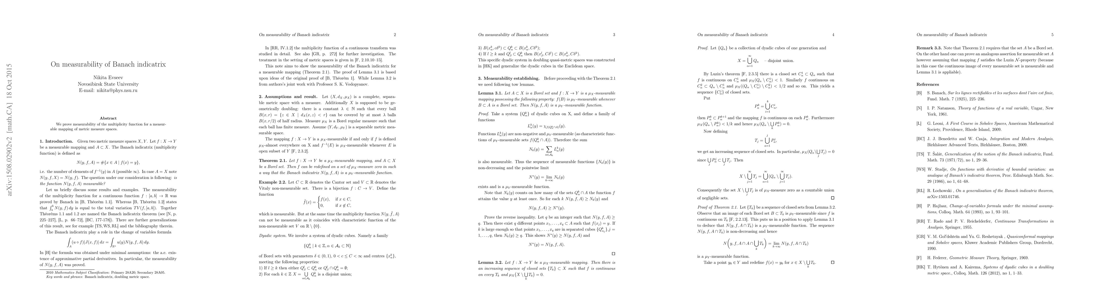 Given two metric measure spaces $X$ and $Y$. Let $f:X\to Y$ be a measurable mapping and $A\subset X$. The Banach indicatrix (multiplicity function) is defined as $N(y,f,A) = \#\{x\in A \mid f(x) = y\}$. We prove measurability of this multiplicity function. The question was also discussed on http://mathoverflow.net/q/206780/15946.