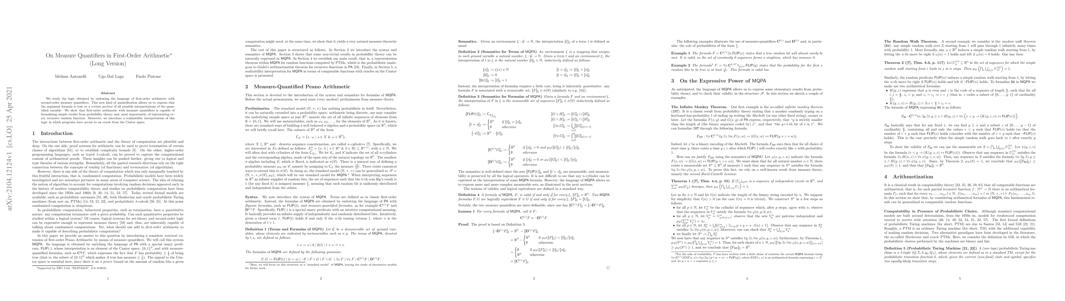 This paper explores first-order arithmetic augmented with second-order measure quantifiers, enabling the expression of probabilistic truths and recursive random functions. It also presents a realizability interpretation allowing programs to utilize an oracle from the Cantor space.