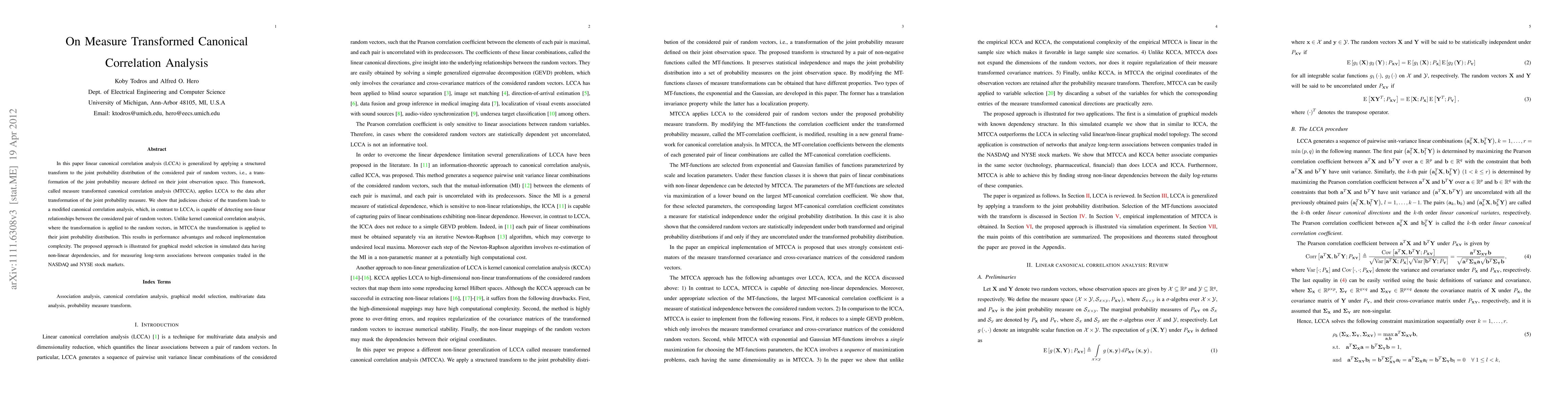 This paper proposes measure transformed canonical correlation analysis (MTCCA), a generalization of linear canonical correlation analysis (LCCA) that applies a structured transform to the joint probability distribution to detect non-linear relationships. Unlike kernel methods, MTCCA transforms the joint probability measure, offering performance benefits and lower complexity.
