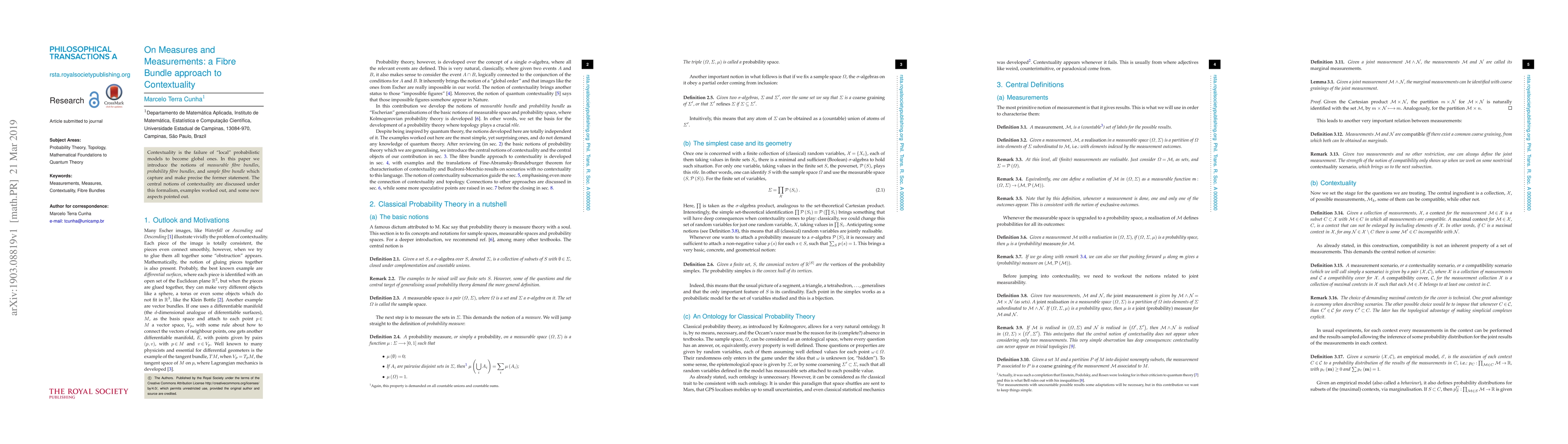 This paper introduces fibre bundle concepts to formalize contextuality, where local probabilistic models fail globally. It precisely defines measurable, probability, and sample fibre bundles to explore contextuality, providing examples and new insights.