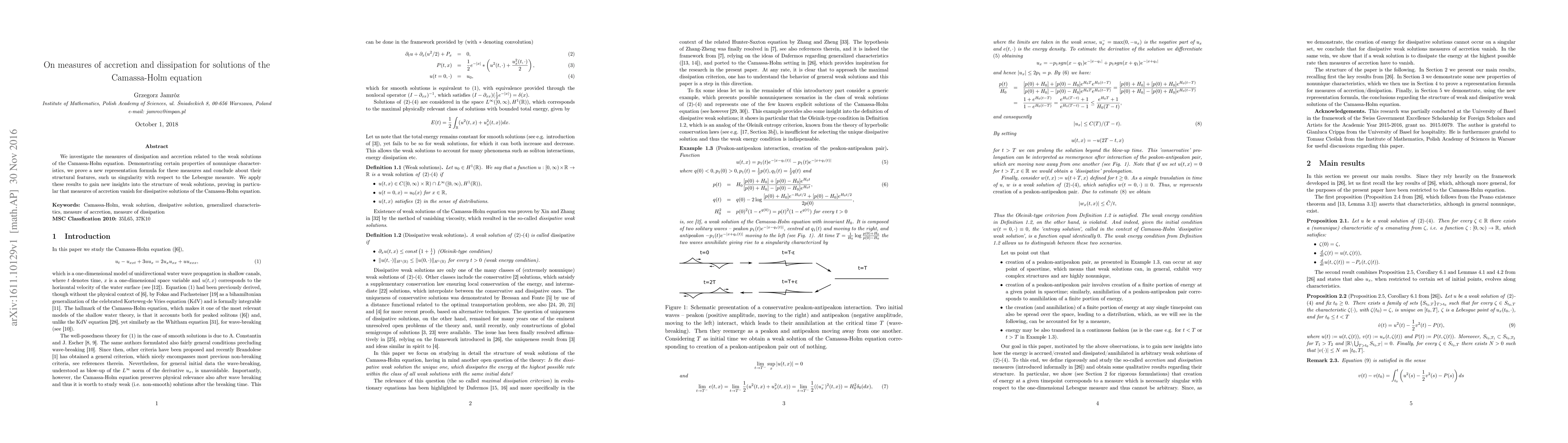 We investigate the measures of dissipation and accretion related to the weak solutions of the Camassa-Holm equation. Demonstrating certain properties of nonunique characteristics, we prove a new representation formula for these measures and conclude about their structural features, such us singularity with respect to the Lebesgue measure. We apply these results to gain new insights into the structure of weak solutions, proving in particular that measures of accretion vanish for dissipative solutions of the Camassa-Holm equation.