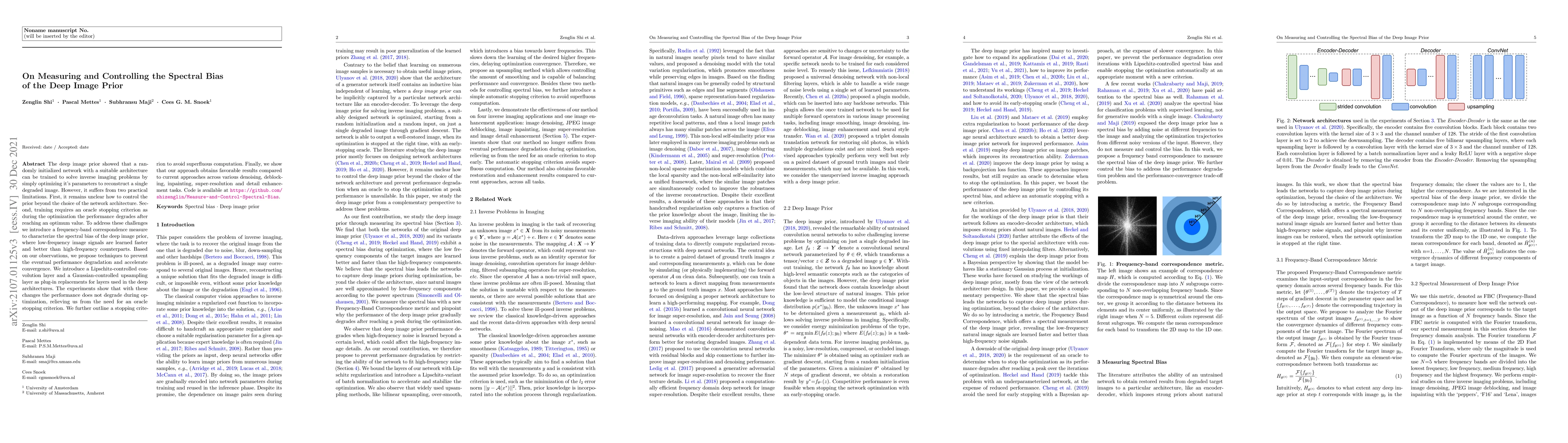 The deep image prior showed that a randomly initialized network with a suitable architecture can be trained to solve inverse imaging problems by simply optimizing it's parameters to reconstruct a single degraded image. However, it suffers from two practical limitations. First, it remains unclear how to control the prior beyond the choice of the network architecture. Second, training requires an oracle stopping criterion as during the optimization the performance degrades after reaching an optimum value. To address these challenges we introduce a frequency-band correspondence measure to characterize the spectral bias of the deep image prior, where low-frequency image signals are learned faster and better than high-frequency counterparts. Based on our observations, we propose techniques to prevent the eventual performance degradation and accelerate convergence. We introduce a Lipschitz-controlled convolution layer and a Gaussian-controlled upsampling layer as plug-in replacements for layers used in the deep architectures. The experiments show that with these changes the performance does not degrade during optimization, relieving us from the need for an oracle stopping criterion. We further outline a stopping criterion to avoid superfluous computation. Finally, we show that our approach obtains favorable results compared to current approaches across various denoising, deblocking, inpainting, super-resolution and detail enhancement tasks. Code is available at \url{https://github.com/shizenglin/Measure-and-Control-Spectral-Bias}.