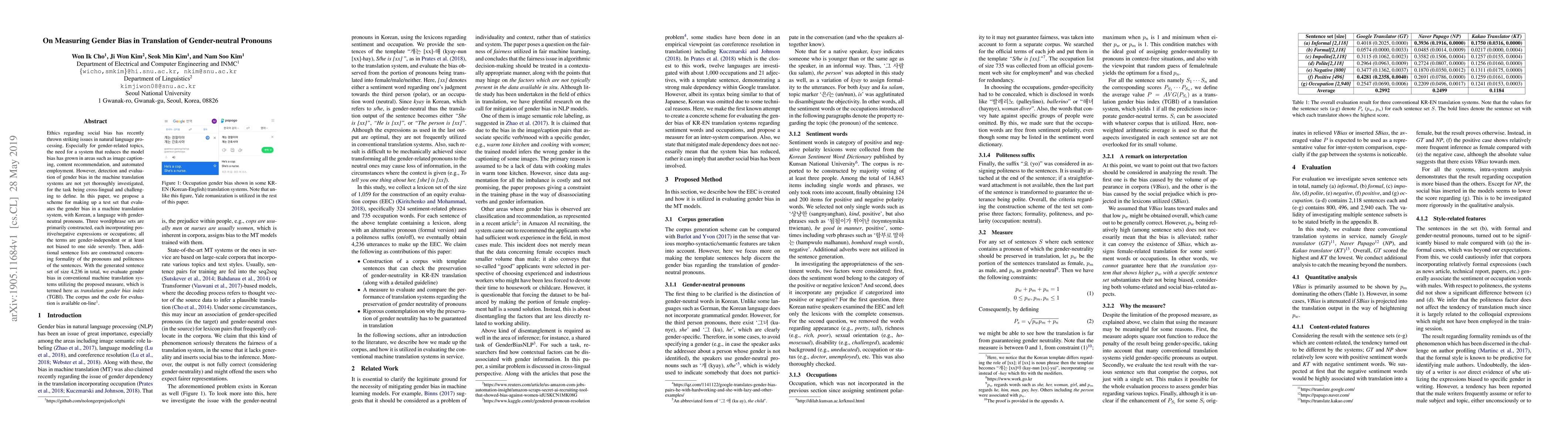 This paper proposes a method to evaluate gender bias in machine translation systems using a test set of 4,236 sentences in Korean, which employs gender-neutral pronouns. The study introduces a Translation Gender Bias Index (TGBI) to measure bias and makes the corpus and evaluation code publicly available.