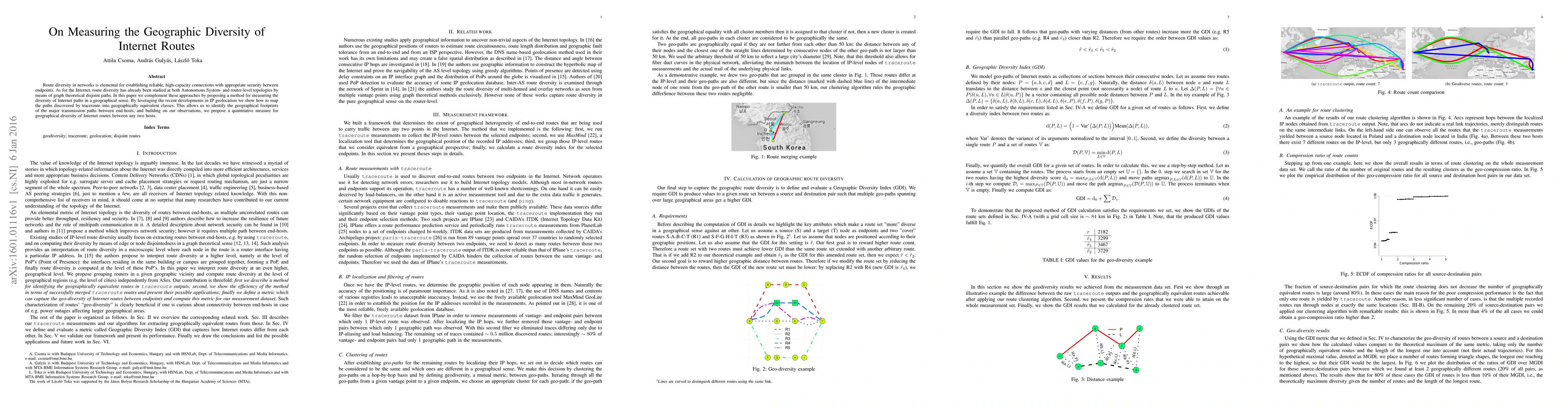 Route diversity in networks is elemental for establishing reliable, high-capacity connections with appropriate security between endpoints. As for the Internet, route diversity has already been studied at both Autonomous System- and router-level topologies by means of graph theoretical disjoint paths. In this paper we complement these approaches by proposing a method for measuring the diversity of Internet paths in a geographical sense. By leveraging the recent developments in IP geolocation we show how to map the paths discovered by traceroute into geographically equivalent classes. This allows us to identify the geographical footprints of the major transmission paths between end-hosts, and building on our observations, we propose a quantitative measure for geographical diversity of Internet routes between any two hosts.