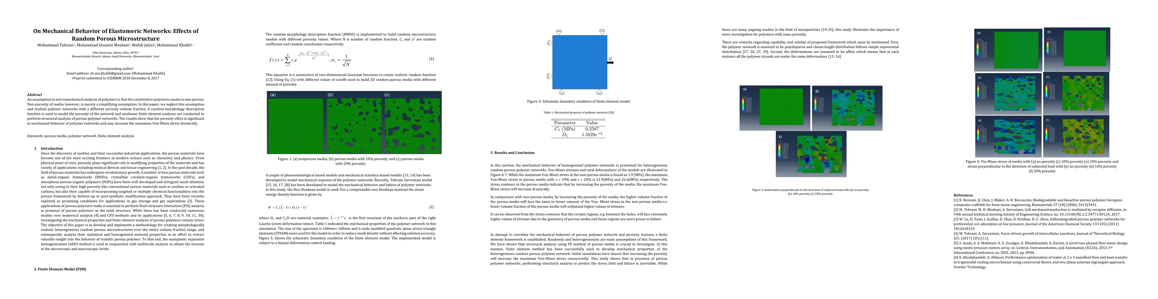 This paper investigates the mechanical behavior of elastomeric networks with random porous microstructures, using a morphology description function to model the porosity. Nonlinear finite element analyses reveal that porosity significantly impacts mechanical behavior, potentially increasing maximum Von-Mises stress.