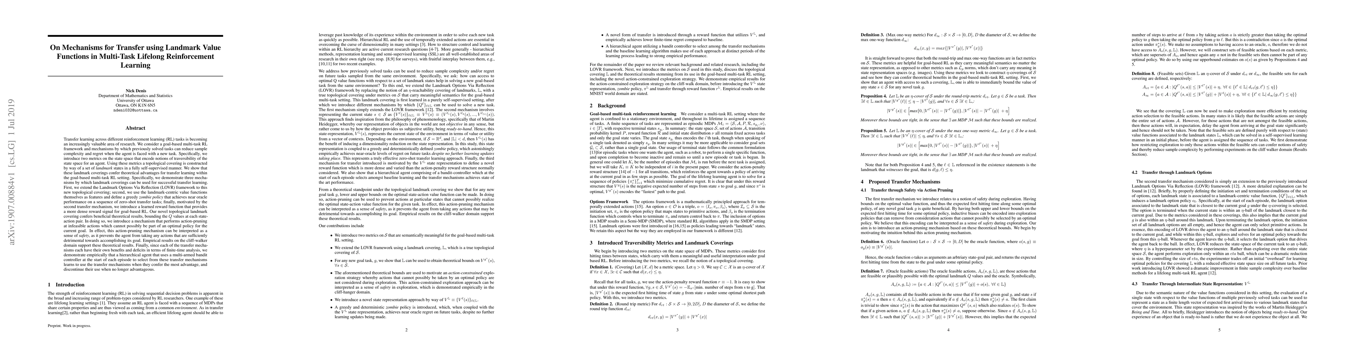 Transfer learning across different reinforcement learning (RL) tasks is becoming an increasingly valuable area of research. We consider a goal-based multi-task RL framework and mechanisms by which previously solved tasks can reduce sample complexity and regret when the agent is faced with a new task. Specifically, we introduce two metrics on the state space that encode notions of traversibility of the state space for an agent. Using these metrics a topological covering is constructed by way of a set of landmark states in a fully self-supervised manner. We show that these landmark coverings confer theoretical advantages for transfer learning within the goal-based multi-task RL setting. Specifically, we demonstrate three mechanisms by which landmark coverings can be used for successful transfer learning. First, we extend the Landmark Options Via Reflection (LOVR) framework to this new topological covering; second, we use the landmark-centric value functions themselves as features and define a greedy zombie policy that achieves near oracle performance on a sequence of zero-shot transfer tasks; finally, motivated by the second transfer mechanism, we introduce a learned reward function that provides a more dense reward signal for goal-based RL. Our novel topological landmark covering confers beneficial theoretical results, bounding the Q values at each state-action pair. In doing so, we introduce a mechanism that performs action-pruning at infeasible actions which cannot possibly be part of an optimal policy for the current goal.