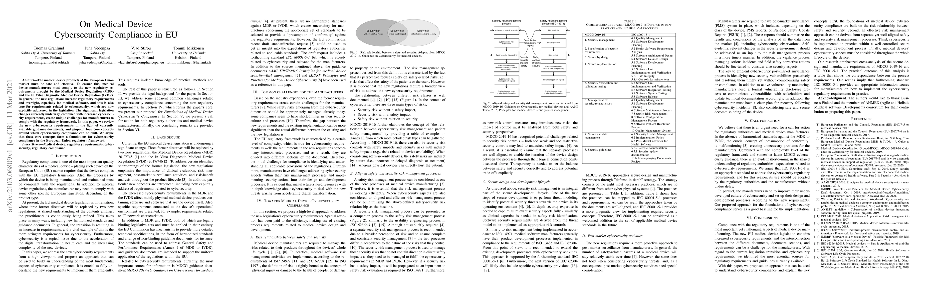 This paper reviews the new cybersecurity regulations in the European Union's Medical Device Regulation (MDR) and In Vitro Diagnostic Medical Device Regulation (IVDR), highlighting the increased regulatory oversight for medical software. It identifies four core concepts that form the foundation for achieving cybersecurity compliance in the EU regulatory framework.