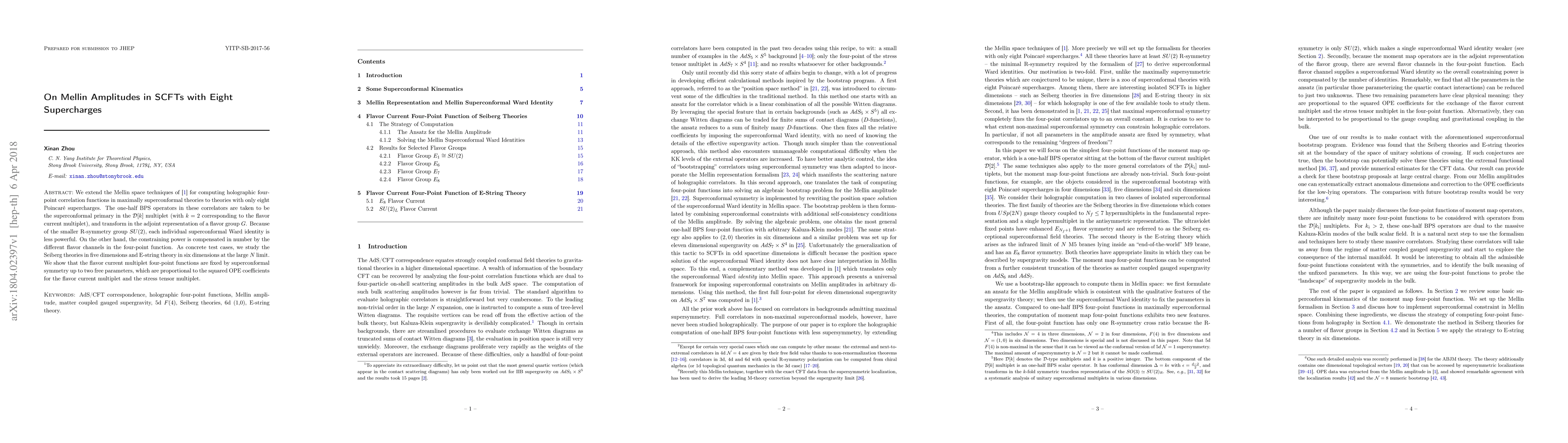We extend the Mellin space techniques of [1] for computing holographic four-point correlation functions in maximally superconformal theories to theories with only eight Poincar\'e supercharges. The one-half BPS operators in these correlators are taken to be the superconformal primary in the $\mathcal{D}[k]$ multiplet (with $k=2$ corresponding to the flavor current multiplet), and transform in the adjoint representation of a flavor group $G$. Because of the smaller R-symmetry group $SU(2)$, each individual superconformal Ward identity is less powerful. On the other hand, the constraining power is compensated in number by the different flavor channels in the four-point function. As concrete test cases, we study the Seiberg theories in five dimensions and E-string theory in six dimensions at the large $N$ limit. We show that the flavor current multiplet four-point functions are fixed by superconformal symmetry up to two free parameters, which are proportional to the squared OPE coefficients for the flavor current multiplet and the stress tensor multiplet.