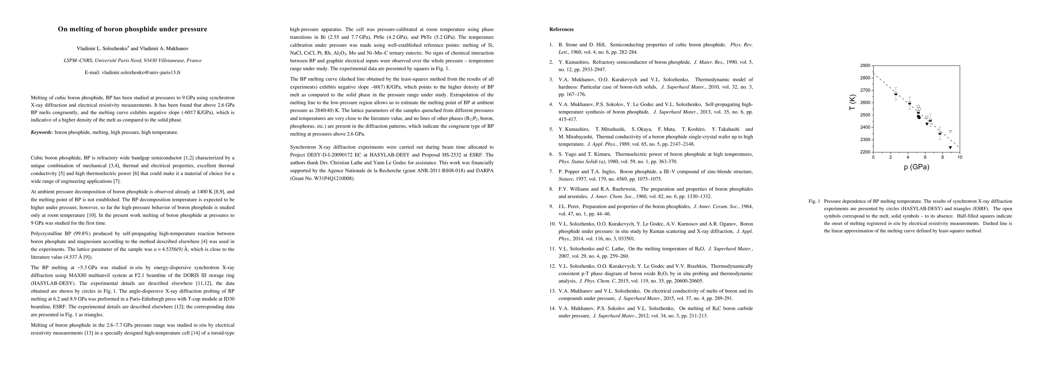 This study investigates the melting behavior of cubic boron phosphide (BP) under pressure up to 9 GPa, revealing that it melts congruently above 2.6 GPa, with a melting curve slope of -60(7) K/GPa, indicating a denser liquid phase compared to the solid.