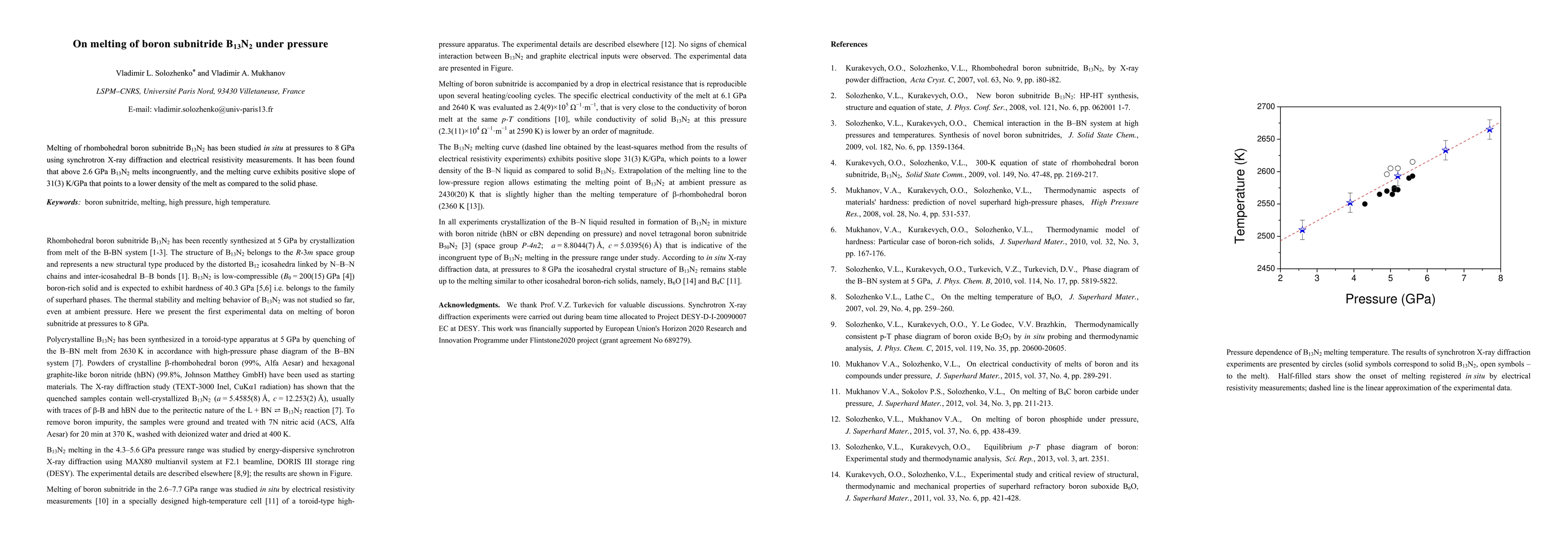 This study investigates the melting behavior of rhombohedral boron subnitride B13N2 under high pressure using synchrotron X-ray diffraction and electrical resistivity. It reveals that B13N2 melts incongruently above 2.6 GPa, with a melting curve slope of 31(3) K/GPa, indicating a lower density of the melt compared to the solid phase.