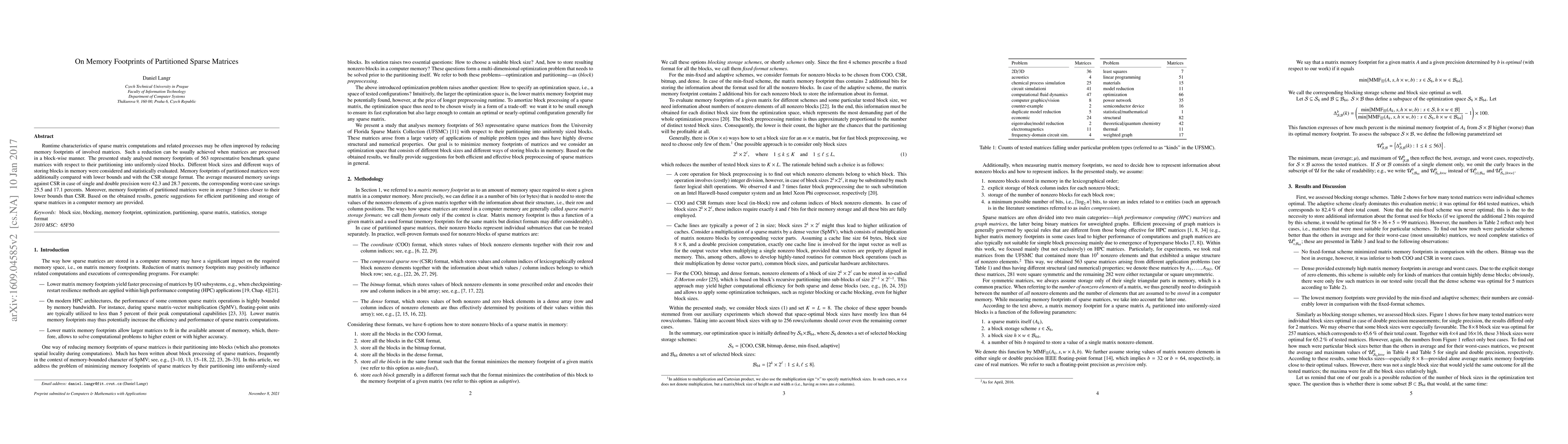 This study analyzes memory footprints of 563 benchmark sparse matrices partitioned into uniformly-sized blocks, comparing different block sizes and storage methods. Results show average memory savings of 42.3% and 28.7% for single and double precision, respectively, over the CSR format, with suggestions for efficient partitioning and storage.