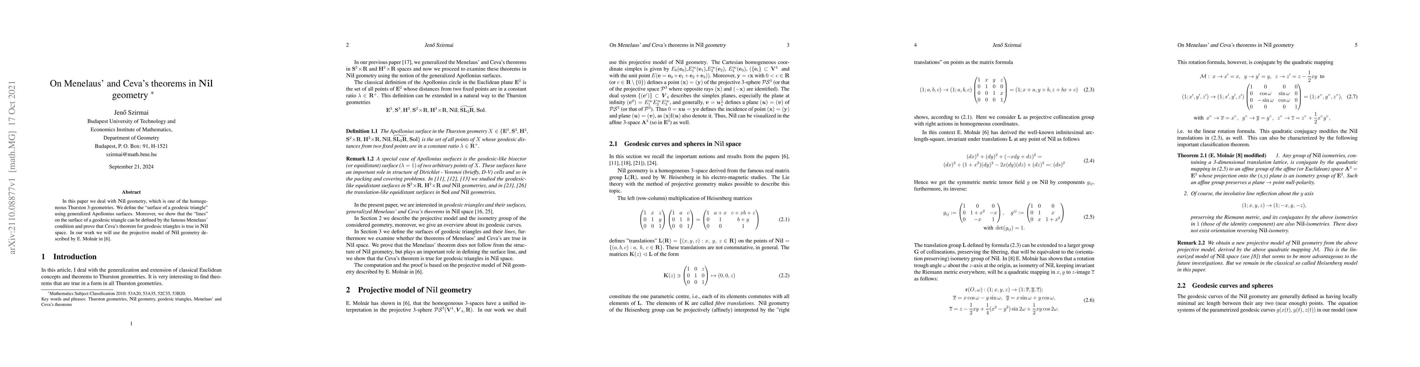 The paper introduces a method to define the 'surface of a geodesic triangle' in $\NIL$ geometry using generalized Apollonius surfaces and proves Menelaus' and Ceva's theorems for geodesic triangles in this context.