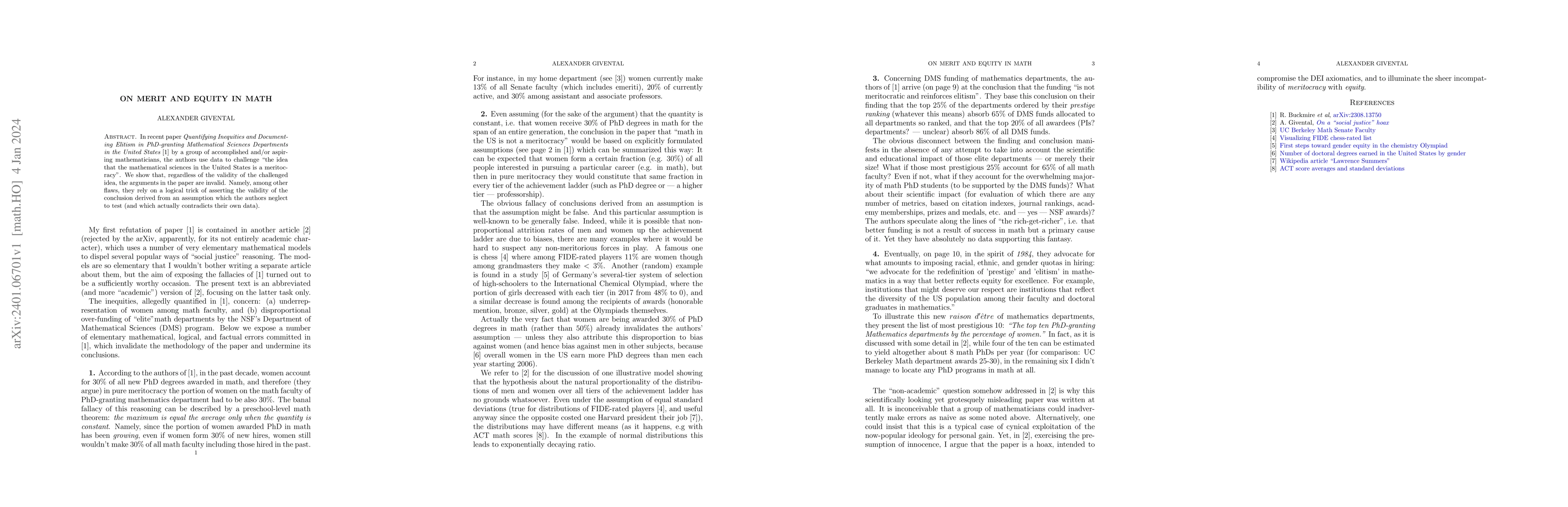 In recent paper "Quantifying Inequities and Documenting Elitism in PhD-granting Mathematical Sciences Departments in the United States" (arXiv:2308.13750) by a group of accomplished and/or aspiring mathematicians, the authors use data to challenge ``the idea that the mathematical sciences in the United States is a meritocracy''. We show that, regardless of the validity of the challenged idea, the arguments in the paper are invalid. Namely, among other flaws, they rely on a logical trick of asserting the validity of the conclusion derived from an assumption which the authors neglect to test (and which actually contradicts their own data).