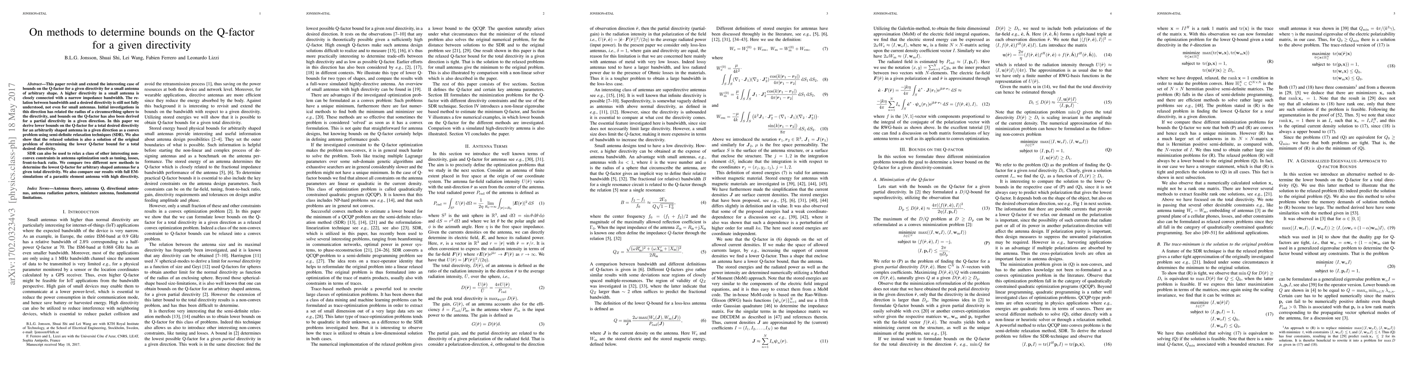This paper develops lower bounds on the Q-factor for a given directivity in arbitrarily shaped small antennas using semi-definite relaxation techniques. It compares two methods for determining the lowest Q-factor and validates results with full electromagnetic simulations.