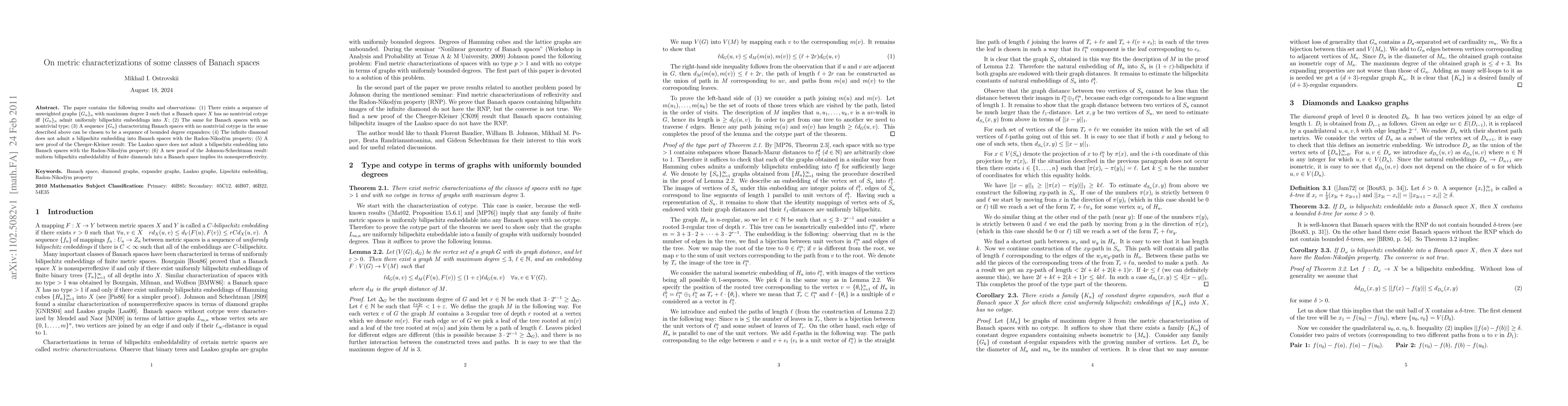 This paper explores metric characterizations of Banach spaces using sequences of unweighted graphs, showing that specific graph embedding properties correspond to the absence of cotype and type in Banach spaces, and provides new proofs for significant embedding results related to the Radon-Nikodým property and nonsuperreflexivity.
