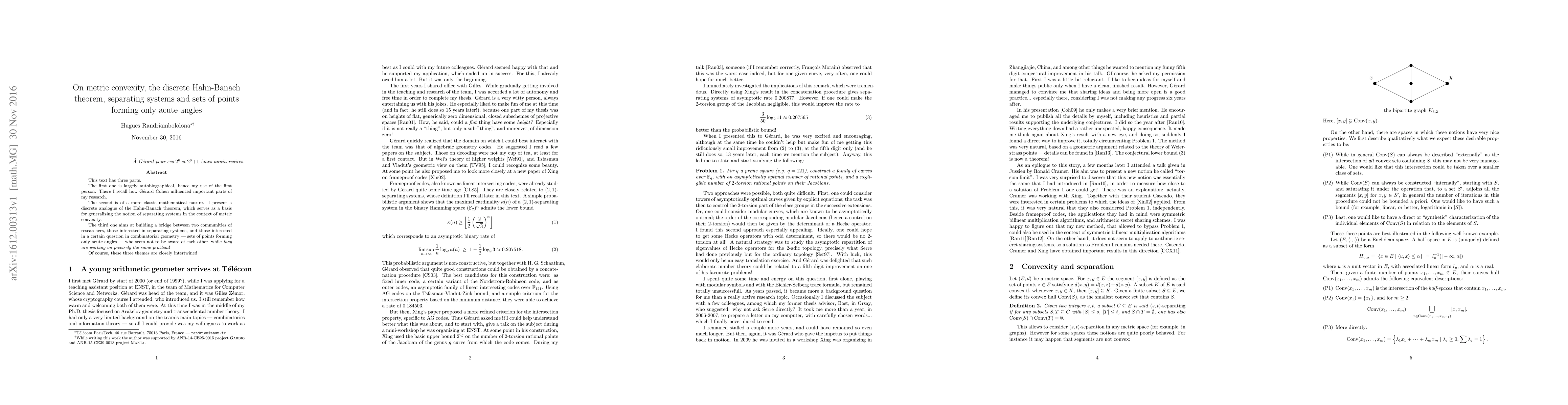 This text has three parts. The first one is largely autobiographical, hence my use of the first person. There I recall how Gerard Cohen influenced important parts of my research. The second is of a more classic mathematical nature. I present a discrete analogue of the Hahn-Banach theorem, which serves as a basis for generalizing the notion of separating systems in the context of metric convexity. The third one aims at building a bridge between two communities of researchers, those interested in separating systems, and those interested in a certain question in combinatorial geometry --- sets of points forming only acute angles --- who seem not to be aware of each other, while they are working on precisely the same problem! Of course, these three themes are closely intertwined.
