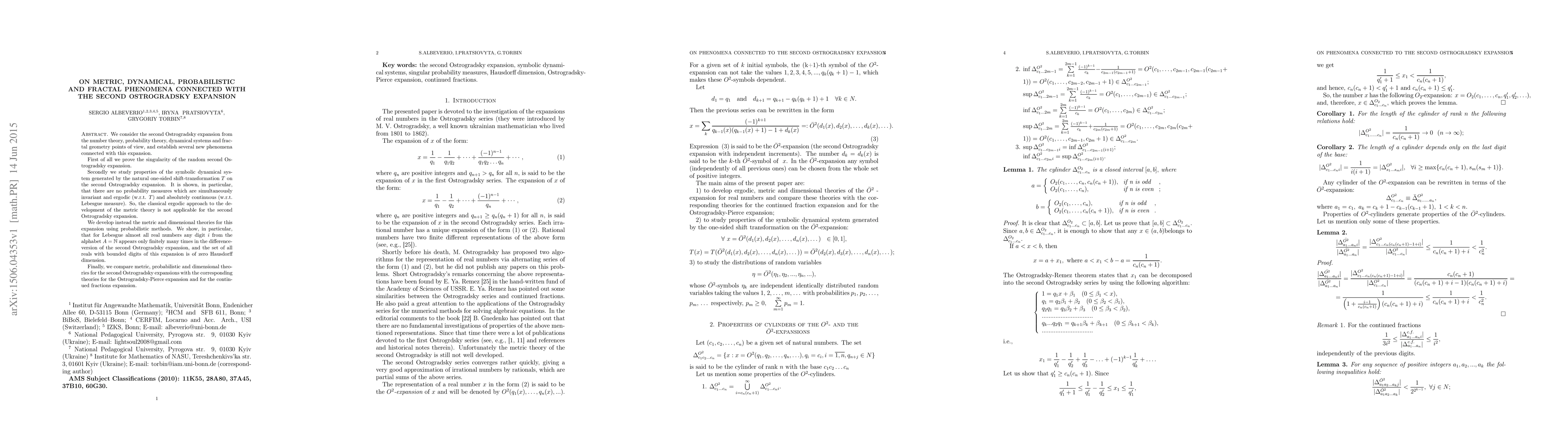 We consider the second Ostrogradsky expansion from the number theory, probability theory, dynamical systems and fractal geometry points of view, and establish several new phenomena connected with this expansion. First of all we prove the singularity of the random second Ostrogradsky expansion. Secondly we study properties of the symbolic dynamical system generated by the natural one-sided shift-transformation $T$ on the second Ostrogradsky expansion. It is shown, in particular, that there are no probability measures which are simultaneously invariant and ergodic (w.r.t. $T$) and absolutely continuous (w.r.t. Lebesgue measure). So, the classical ergodic approach to the development of the metric theory is not applicable for the second Ostrogradsky expansion. We develop instead the metric and dimensional theories for this expansion using probabilistic methods. We show, in particular, that for Lebesgue almost all real numbers any digit $i$ from the alphabet $A= \mathbb{N} $ appears only finitely many times in the difference-version of the second Ostrogradsky expansion, and the set of all reals with bounded digits of this expansion is of zero Hausdorff dimension. Finally, we compare metric, probabilistic and dimensional theories for the second Ostrogradsky expansions with the corresponding theories for the Ostrogradsky-Pierce expansion and for the continued fractions expansion.
