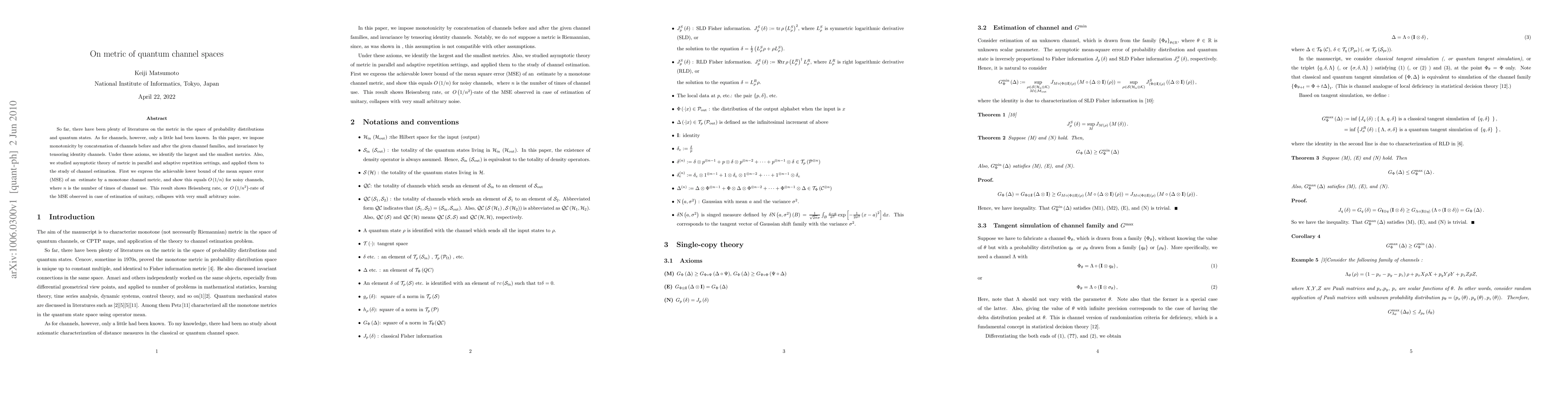 So far, there have been plenty of literatures on the metric in the space of probability distributions and quantum states. As for channels, however, only a little had been known. In this paper, we impose monotonicity by concatenation of channels before and after the given channel families, and invariance by tensoring identity channels. Under these axioms, we identify the largest and the smallest metrics. Also, we studied asymptotic theory of metric in parallel and adaptive repetition settings, and applied them to the study of channel estimation. First we express the achievable lower bound of the mean square error (MSE) of an estimate by a monotone channel metric, and show this equals O(1/n) for noisy channels, where n is the number of times of channel use. This result shows Heisenberg rate, or O(1/n^2)-rate of the MSE observed in case of estimation of unitary, collapses with very small arbitrary noise.