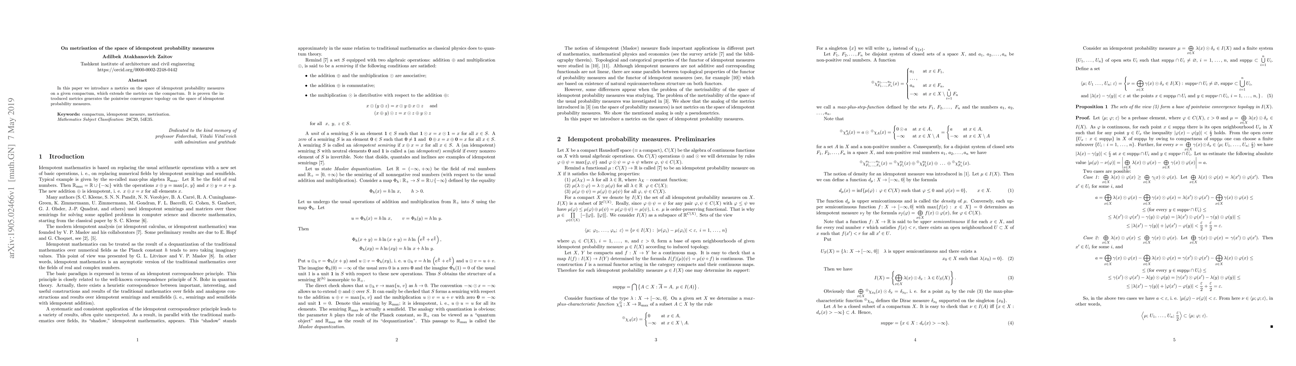 This paper proposes a new metric on the space of idempotent probability measures over a compact set, extending existing metrics on the compactum. The introduced metric is shown to generate the pointwise convergence topology for this space.