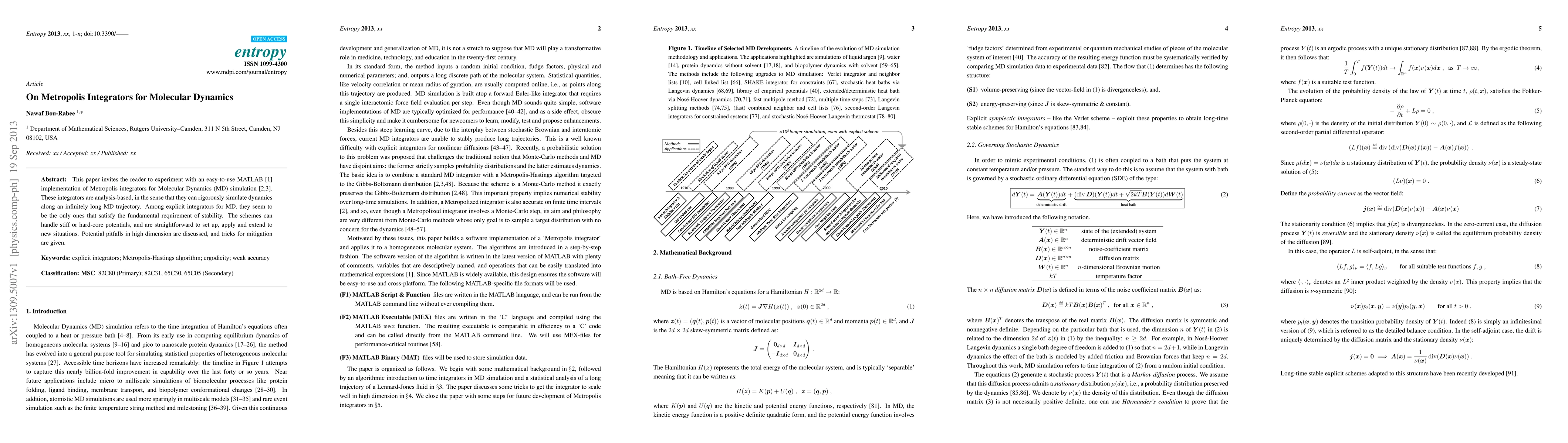 This paper invites the reader to experiment with an easy-to-use MATLAB implementation of Metropolis integrators for Molecular Dynamics (MD) simulation. These integrators are analysis-based, in the sense that they can rigorously simulate dynamics along an infinitely long MD trajectory. Among explicit integrators for MD, they seem to be the only ones that satisfy the fundamental requirement of stability. The schemes can handle stiff or hard-core potentials, and are straightforward to set up, apply and extend to new situations. Potential pitfalls in high dimension are discussed, and tricks for mitigation are given.