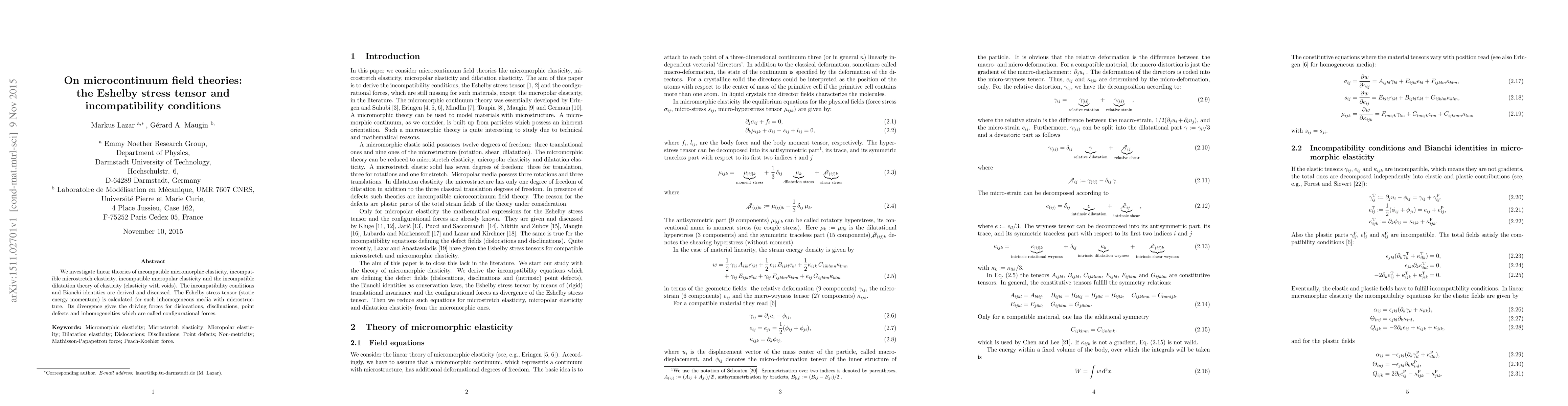 This paper explores linear theories of various incompatible microcontinuum elasticity models, deriving incompatibility conditions and Bianchi identities. It calculates the Eshelby stress tensor for microstructurally inhomogeneous media, identifying configurational forces that drive dislocations and other defects.