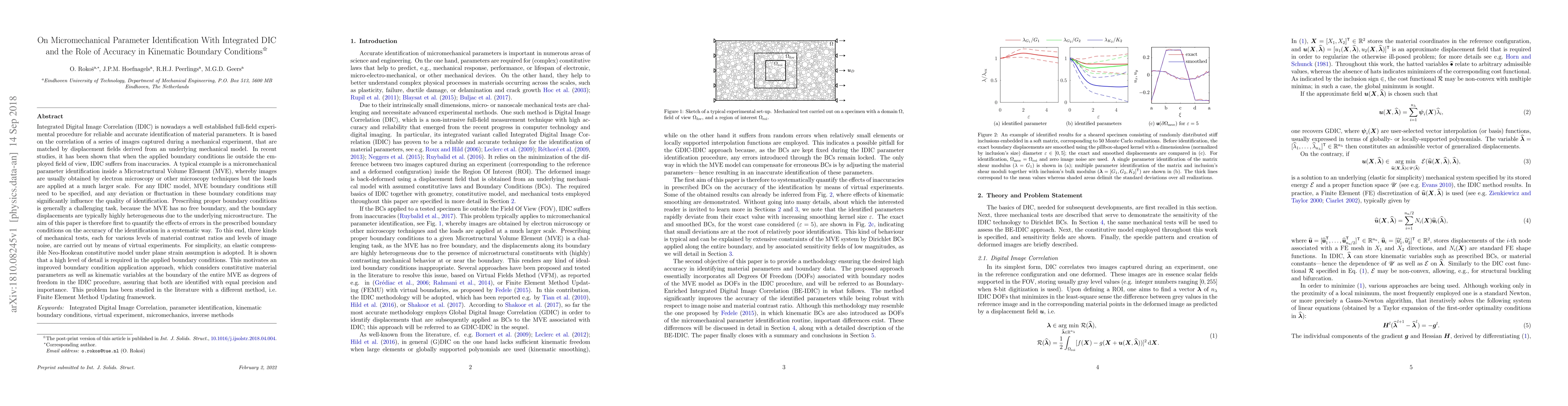 Integrated Digital Image Correlation (IDIC) is nowadays a well established full-field experimental procedure for reliable and accurate identification of material parameters. It is based on the correlation of a series of images captured during a mechanical experiment, that are matched by displacement fields derived from an underlying mechanical model. In recent studies, it has been shown that when the applied boundary conditions lie outside the employed field of view, IDIC suffers from inaccuracies. A typical example is a micromechanical parameter identification inside a Microstructural Volume Element (MVE), whereby images are usually obtained by electron microscopy or other microscopy techniques but the loads are applied at a much larger scale. For any IDIC model, MVE boundary conditions still need to be specified, and any deviation or fluctuation in these boundary conditions may significantly influence the quality of identification. Prescribing proper boundary conditions is generally a challenging task, because the MVE has no free boundary, and the boundary displacements are typically highly heterogeneous due to the underlying microstructure. The aim of this paper is therefore first to quantify the effects of errors in the prescribed boundary conditions on the accuracy of the identification in a systematic way. To this end, three kinds of mechanical tests, each for various levels of material contrast ratios and levels of image noise, are carried out by means of virtual experiments. For simplicity, an elastic compressible Neo-Hookean constitutive model under plane strain assumption is adopted. It is shown that a high level of detail is required in the applied boundary conditions. This motivates an improved boundary condition application approach, which considers constitutive material parameters as well as kinematic variables at the boundary of the entire MVE as degrees of freedom in...