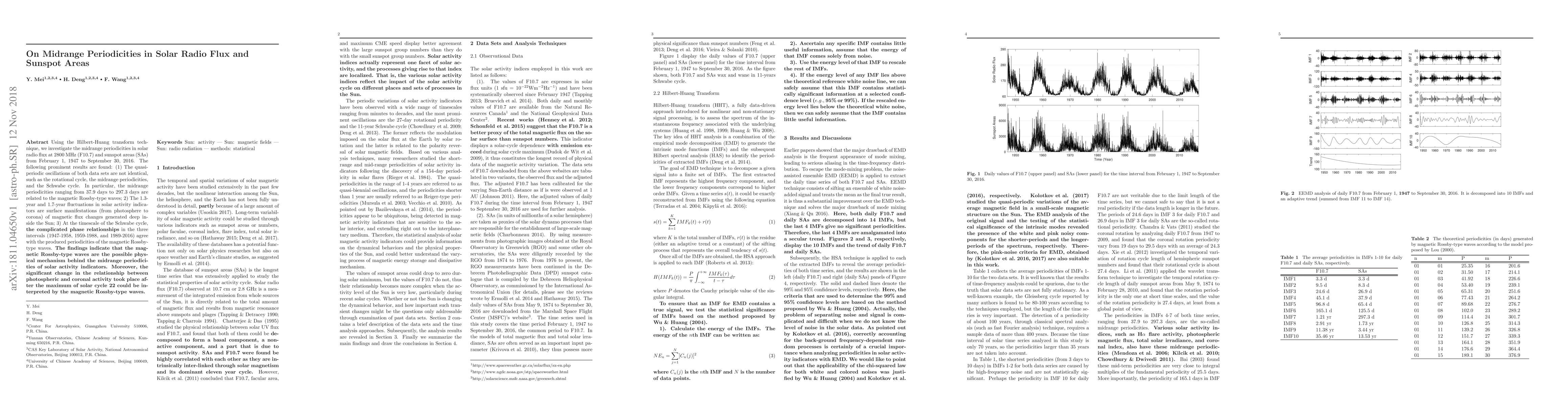 This study employs the Hilbert-Huang transform to identify midrange periodicities in solar radio flux and sunspot areas from 1947 to 2016, revealing distinct quasi-periodic oscillations and suggesting that magnetic Rossby-type waves drive these fluctuations, particularly the 1.3-year and 1.7-year cycles linked to deep magnetic flux changes.