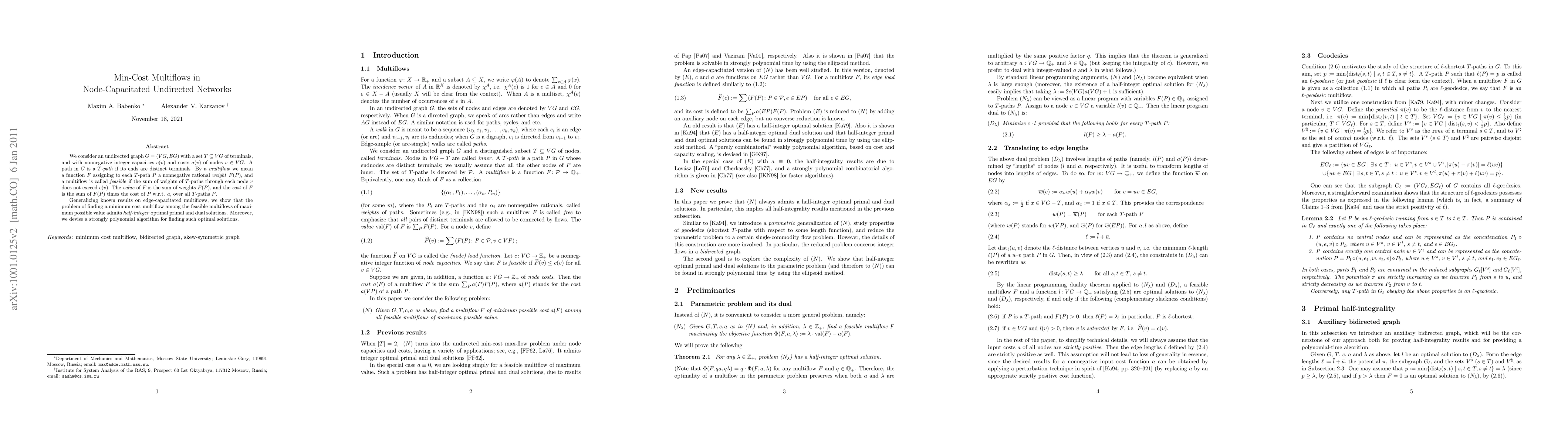 This paper solves the Min-Cost Multiflow Problem in Node-Capacitated Undirected Networks, finding half-integer optimal primal and dual solutions using a strongly polynomial algorithm.