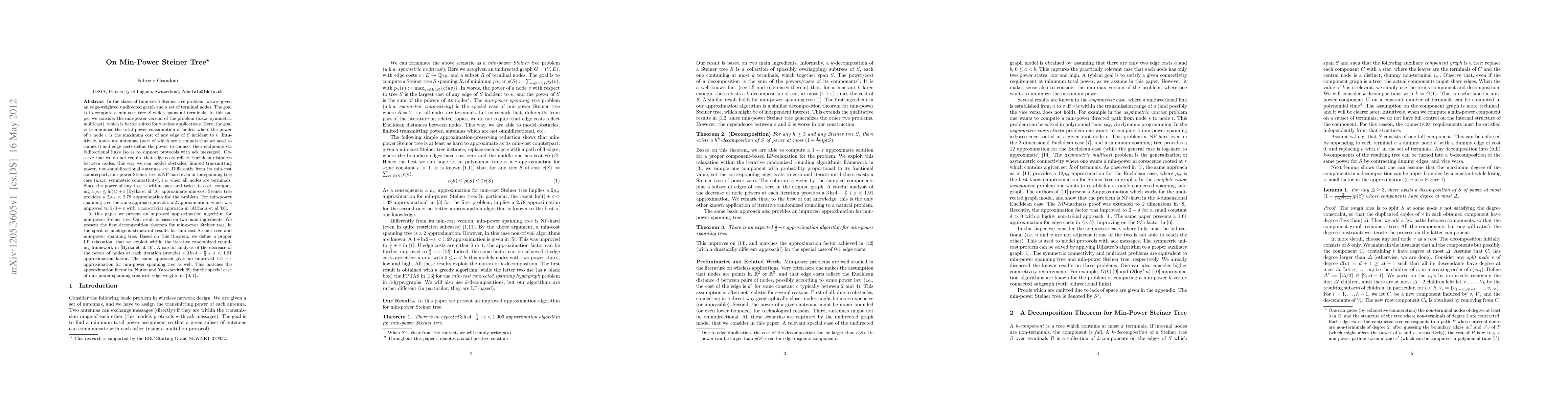 This paper addresses the min-power Steiner tree problem, focusing on minimizing total power consumption in wireless networks. It presents an improved approximation algorithm achieving a 1.91 approximation factor, leveraging a decomposition theorem and an iterative randomized rounding framework. The approach also yields an enhanced 1.5+eps approximation for the min-power spanning tree.
