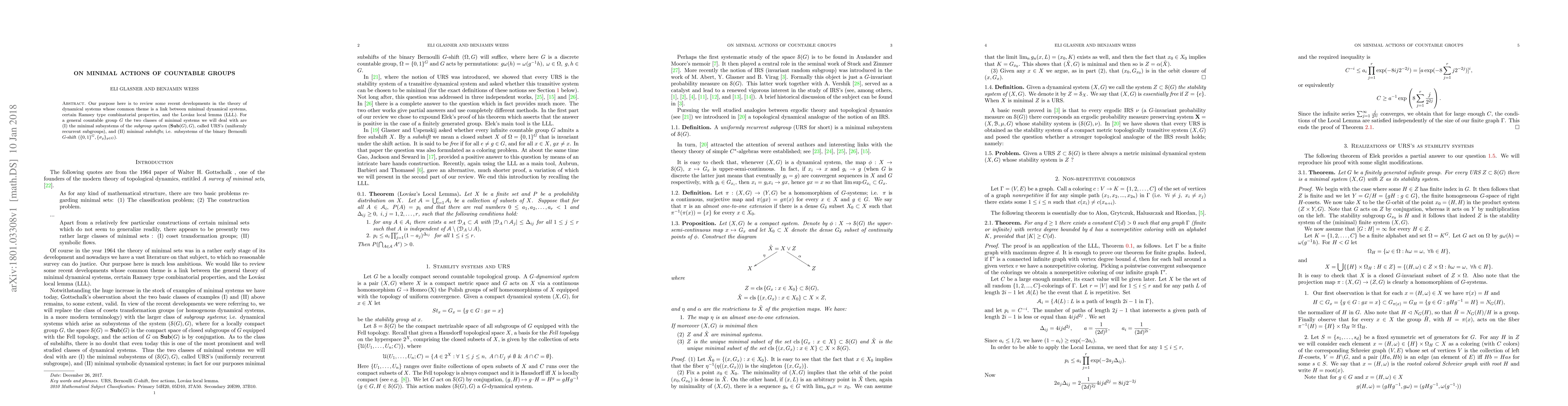 Our purpose here is to review some recent developments in the theory of dynamical systems whose common theme is a link between minimal dynamical systems, certain Ramsey type combinatorial properties, and the Lovasz local lemma (LLL). For a general countable group G the two classes of minimal systems we will deal with are (I) the minimal subsystems of the {\em subgroup system} (Sub(G), G), called URS's (uniformly recurrent subgroups), and (II) minimal {\em subshifts}; i.e. subsystems of the binary Bernoulli G-shift ({0, 1}^G, {\sig_g}_{g \in G}).