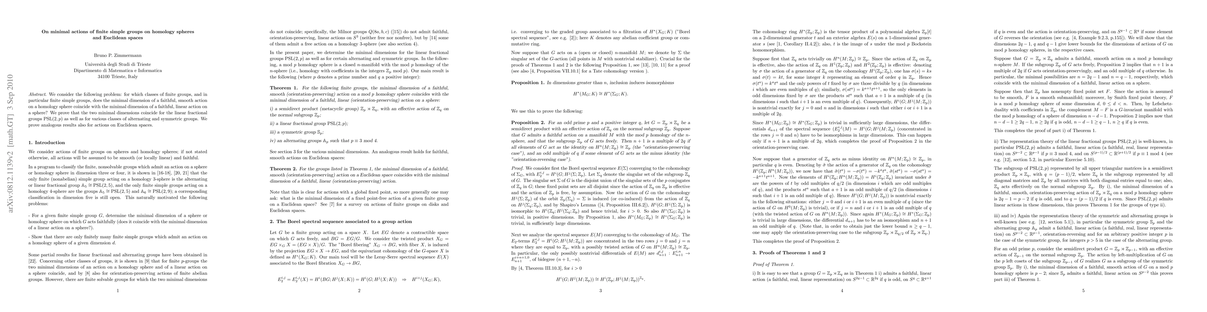Summary: This paper investigates when the minimal dimension of a faithful smooth action of finite simple groups on homology spheres matches that of their faithful linear actions on spheres. It proves the equivalence for PSL(2,p) and several alternating/symmetric groups, and extends these findings to actions on Euclidean spaces.