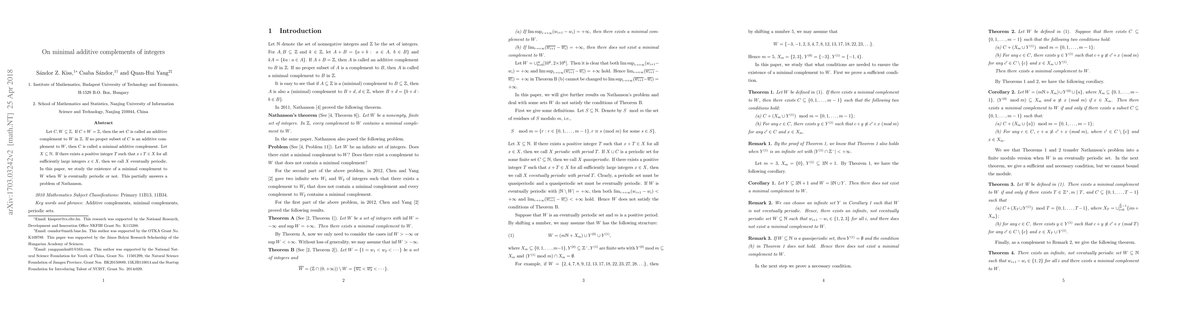 This paper investigates the existence of minimal additive complements $C$ to a set $W \subseteq \mathbb{Z}$ given that $W$ is eventually periodic or not, addressing a question posed by Nathanson.