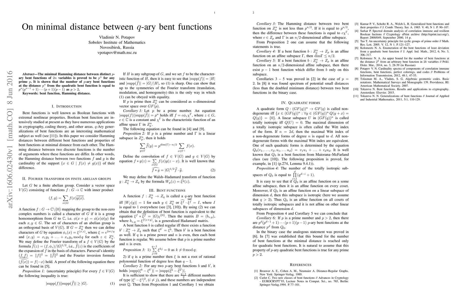 The minimal Hamming distance between distinct $p$-ary bent functions of $2n$ variables is proved to be $p^n$ for any prime $p$. It is shown that the number of $p$-ary bent functions at the distance $p^n$ from the quadratic bent function is equal to $p^n(p^{n-1}+1)\cdots(p+1)(p-1)$ as $p>2$.