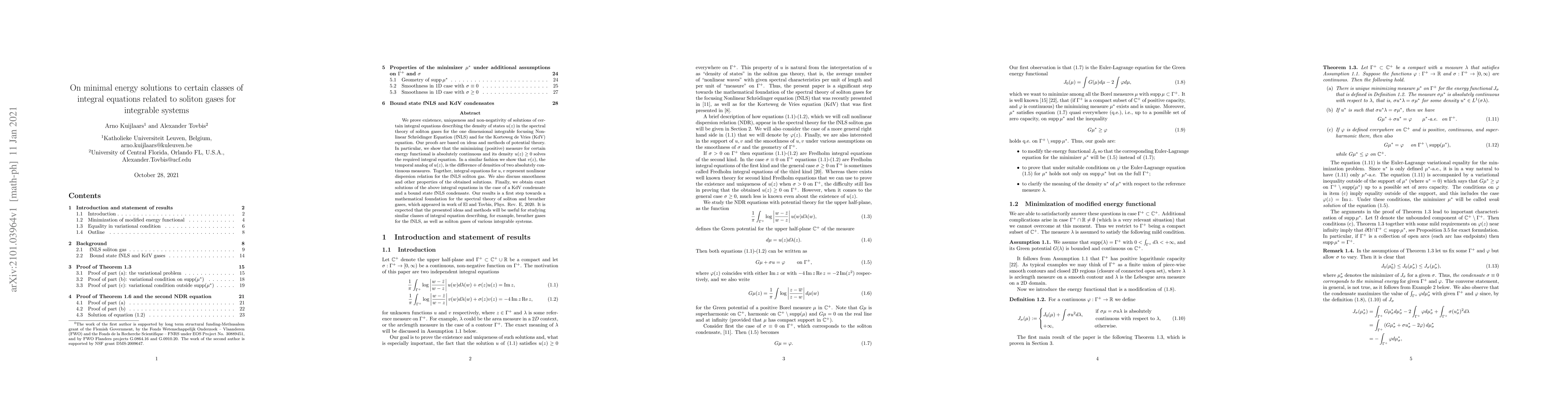 This paper establishes the existence, uniqueness, and non-negativity of solutions for integral equations describing soliton gas densities in the spectral theory of integrable systems like the fNLS and KdV equations. The authors utilize potential theory to demonstrate that the minimal energy solutions are absolutely continuous and non-negative, providing exact solutions for specific cases.