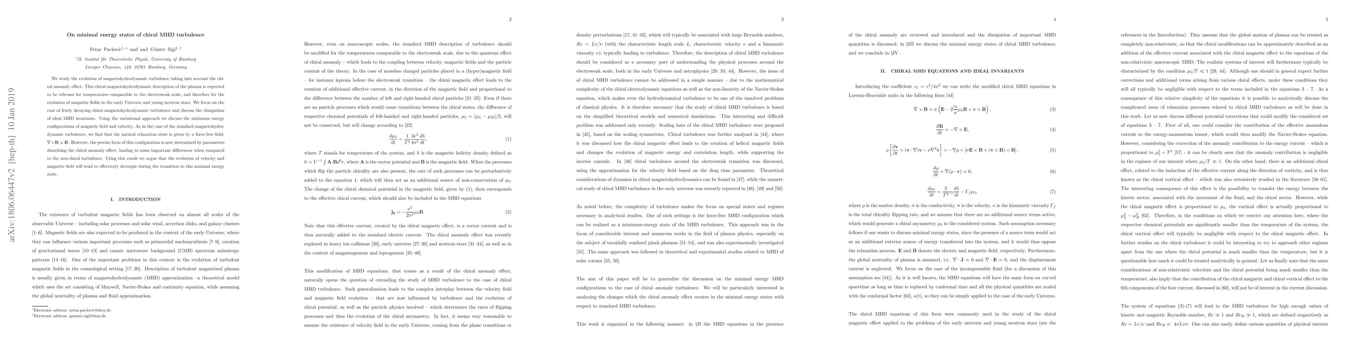 We study the evolution of magnetohydrodynamic turbulence taking into account the chiral anomaly effect. This chiral magnetohydrodynamic description of the plasma is expected to be relevant for temperatures comparable to the electroweak scale, and therefore for the evolution of magnetic fields in the early Universe and young neutron stars. We focus on the case of freely decaying chiral magnetohydrodynamic turbulence and discuss the dissipation of ideal MHD invariants. Using the variational approach we discuss the minimum energy configurations of magnetic field and velocity. As in the case of the standard magnetohydrodynamic turbulence, we find that the natural relaxation state is given by a force-free field, $\nabla \times \mathbf{B} \propto \mathbf{B}$. However, the precise form of this configuration is now determined by parameters describing the chiral anomaly effect, leading to some important differences when compared to the non-chiral turbulence. Using this result we argue that the evolution of velocity and magnetic field will tend to effectively decouple during the transition to this minimal energy state.