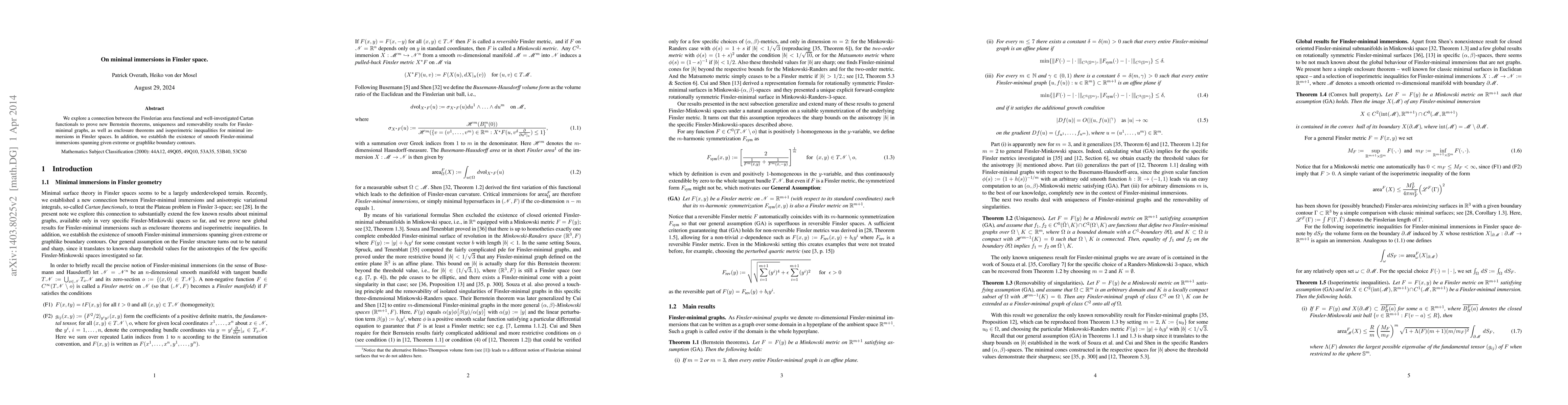 This paper establishes new Bernstein theorems and uniqueness results for Finsler-minimal graphs by linking the Finslerian area functional with Cartan functionals. It also proves enclosure theorems and isoperimetric inequalities for minimal immersions in Finsler spaces and demonstrates the existence of smooth Finsler-minimal immersions for specified boundary contours.