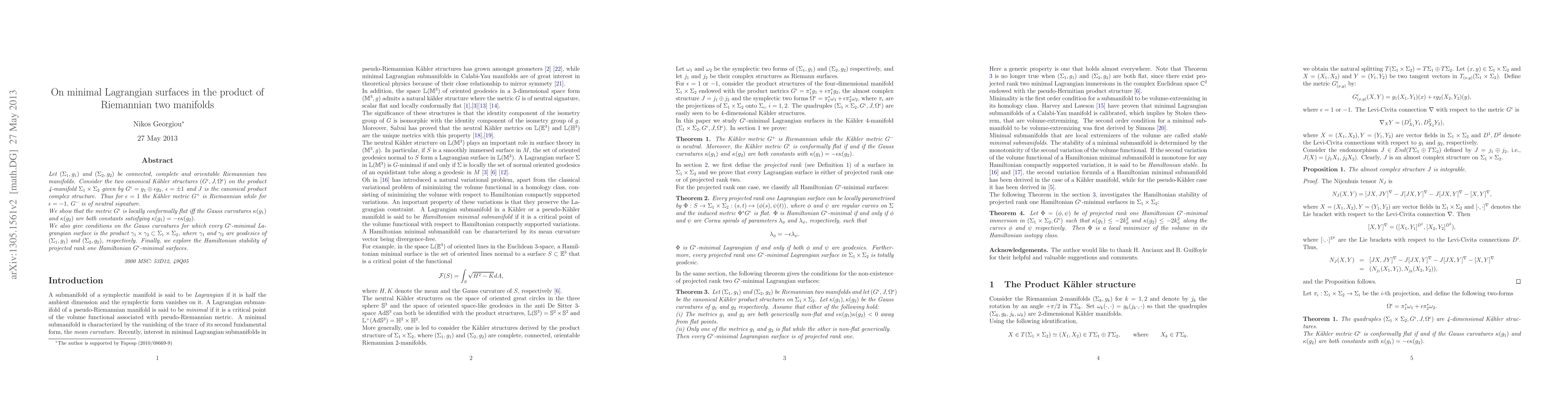 Let $(\Sigma_1,g_1)$ and $(\Sigma_2,g_2)$ be connected, complete and orientable Riemannian two manifolds. Consider the two canonical K\"ahler structures $(G^{\epsilon},J,\Omega^{\epsilon})$ on the product 4-manifold $\Sigma_1\times\Sigma_2$ given by $ G^{\epsilon}=g_1\oplus \epsilon g_2$, $\epsilon=\pm 1$ and $J$ is the canonical product complex structure. Thus for $\epsilon=1$ the K\"ahler metric $G^+$ is Riemannian while for $\epsilon=-1$, $G^-$ is of neutral signature. We show that the metric $G^{\epsilon}$ is locally conformally flat iff the Gauss curvatures $\kappa(g_1)$ and $\kappa(g_2)$ are both constants satisfying $\kappa(g_1)=-\epsilon\kappa(g_2)$. We also give conditions on the Gauss curvatures for which every $G^{\epsilon}$-minimal Lagrangian surface is the product $\gamma_1\times\gamma_2\subset\Sigma_1\times\Sigma_2$, where $\gamma_1$ and $\gamma_2$ are geodesics of $(\Sigma_1,g_1)$ and $(\Sigma_2,g_2)$, respectively. Finally, we explore the Hamiltonian stability of projected rank one Hamiltonian $G^{\epsilon}$-minimal surfaces.