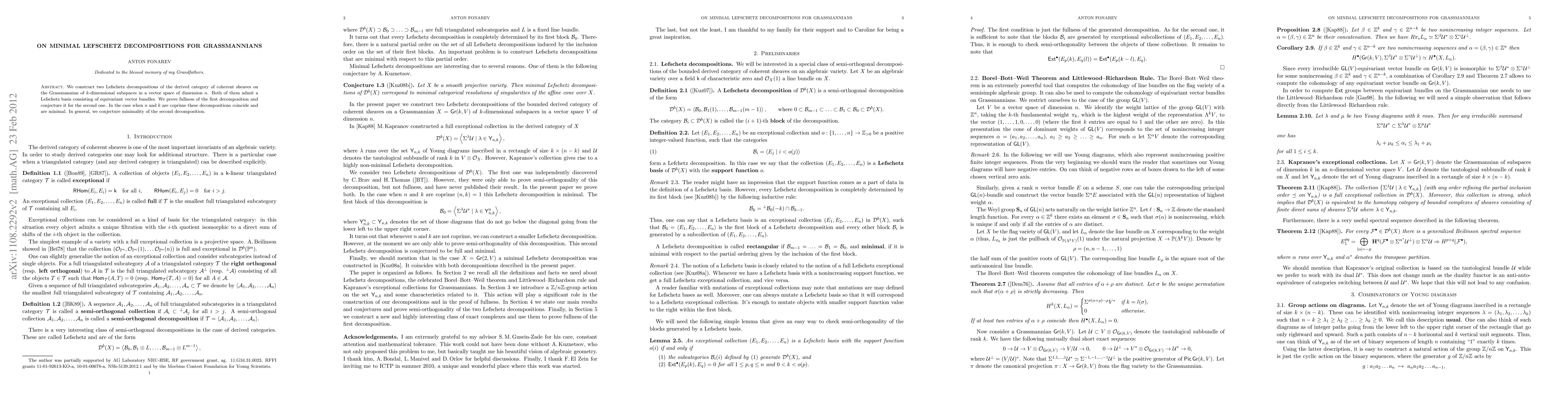 Researchers created two Lefschetz decompositions for the Grassmannian of subspaces in a vector space, one that is proven minimal and another conjectured to be minimal.