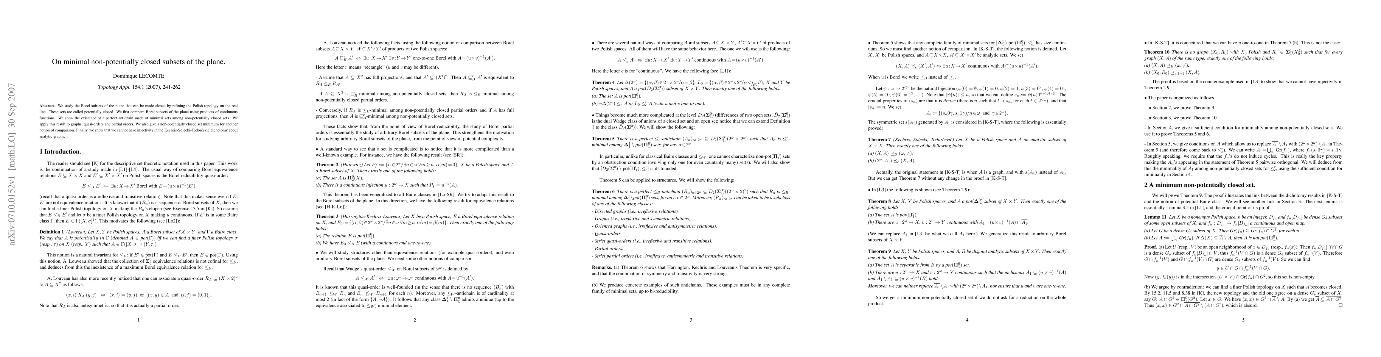 This paper investigates Borel subsets of the plane that can be refined to closed sets under Polish topology. It demonstrates the existence of a perfect antichain of minimal non-potentially closed sets and applies these findings to graphs, quasi-orders, and partial orders, ultimately challenging the Kechris-Solecki-Todorcevic dichotomy.